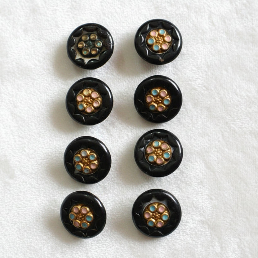 This set of eight small Victorian buttons is truly astounding in person, with their inky black glossy fronts featuring delicate polychrome painted designs: clusters of tiny pastel pink, light blue, and gold dots or floral motifs arranged in a rosette pattern, set against a raised or scalloped black border for added Victorian elegance.