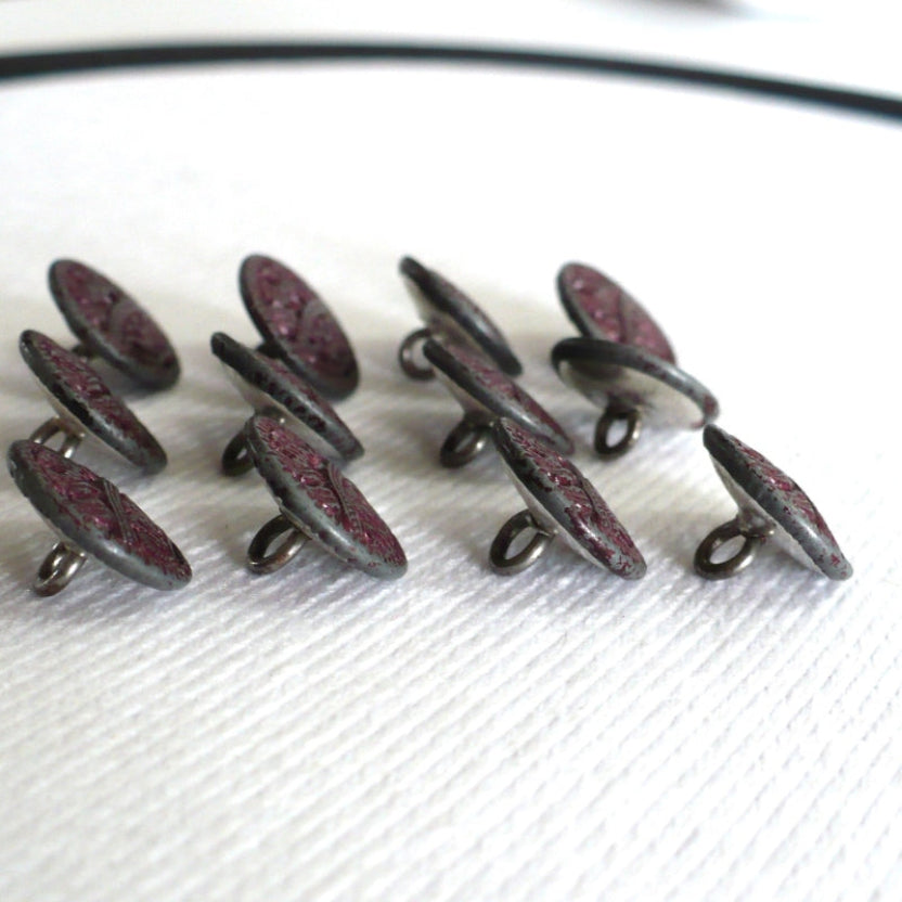 Antique 1920s French Pierced Metal Burgundy Enamel Floral Buttons Set of 12, 21L.