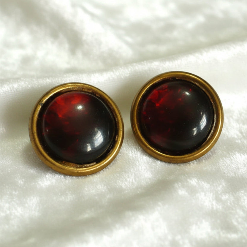 A pair of medium vintage cabochon shank buttons features a deep red translucent cabochon set in a brass or bronze metal frame with a loop shank on the back. The design showcases a domed, glossy cabochon with a vibrant, jewel-toned, rich garnet-like red color that catches the light beautifully.