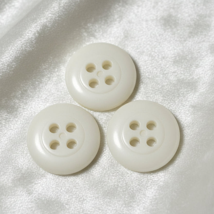 Set of three white casein buttons dating to the early 1940s, a peak period for casein button production when matte finishes in neutral tones like white were popular for everyday and utilitarian garments during and after World War II. This aligns with the simple, practical design seen here, which was mass-produced for shirts and workwear.