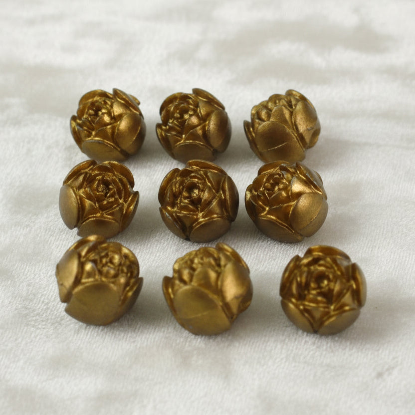 Charming set of nine small vintage 1950s rosebud buttons, crafted in brassy gold-tone casein plastic with sturdy tunnel shanks. These delicate little florals capture the mid-century love of elegant, wearable detail. Each button measures about 15 lignes (approximately 9.5mm or 3/8 inch), making them ideal for blouses, dresses, cardigans, jackets, or even creative jewelry and craft projects.