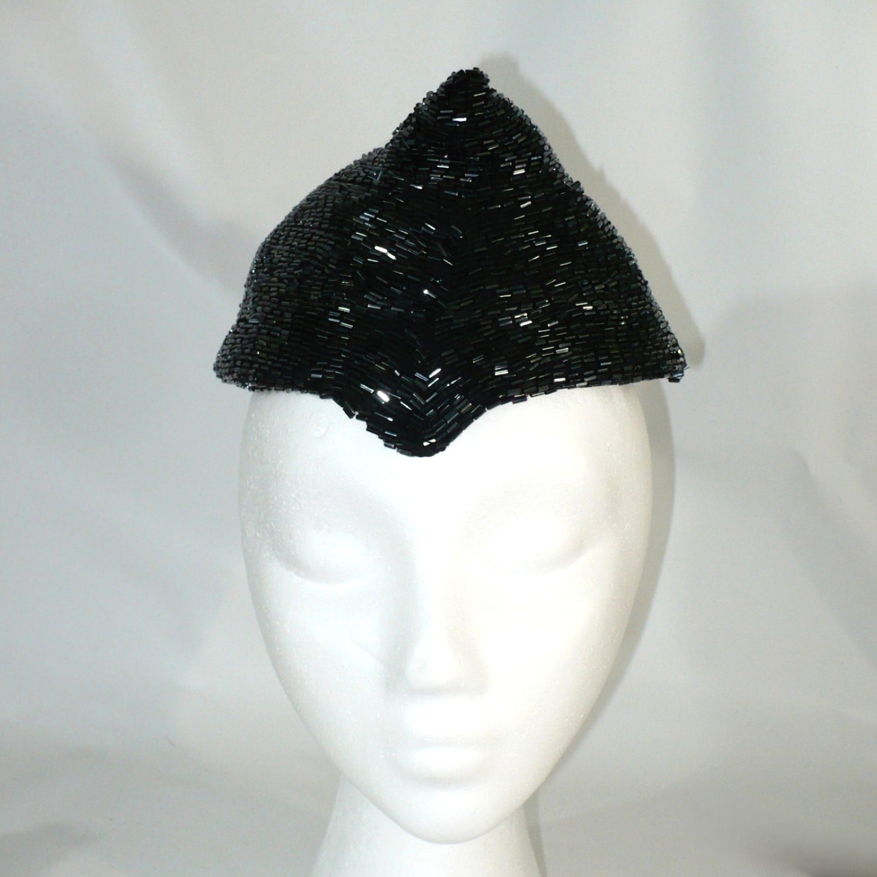 This exquisite 1950s bespoke beaded evening hat is a striking example of mid-century glamour. Crafted in a sharp pixie silhouette, it's fully adorned with shimmering black bugle beads that catch the light from every angle. The pointed front adds a touch of drama, while three interlocking beaded rings at the back highlight the meticulous handwork and thoughtful design typical of high fashion from the era.