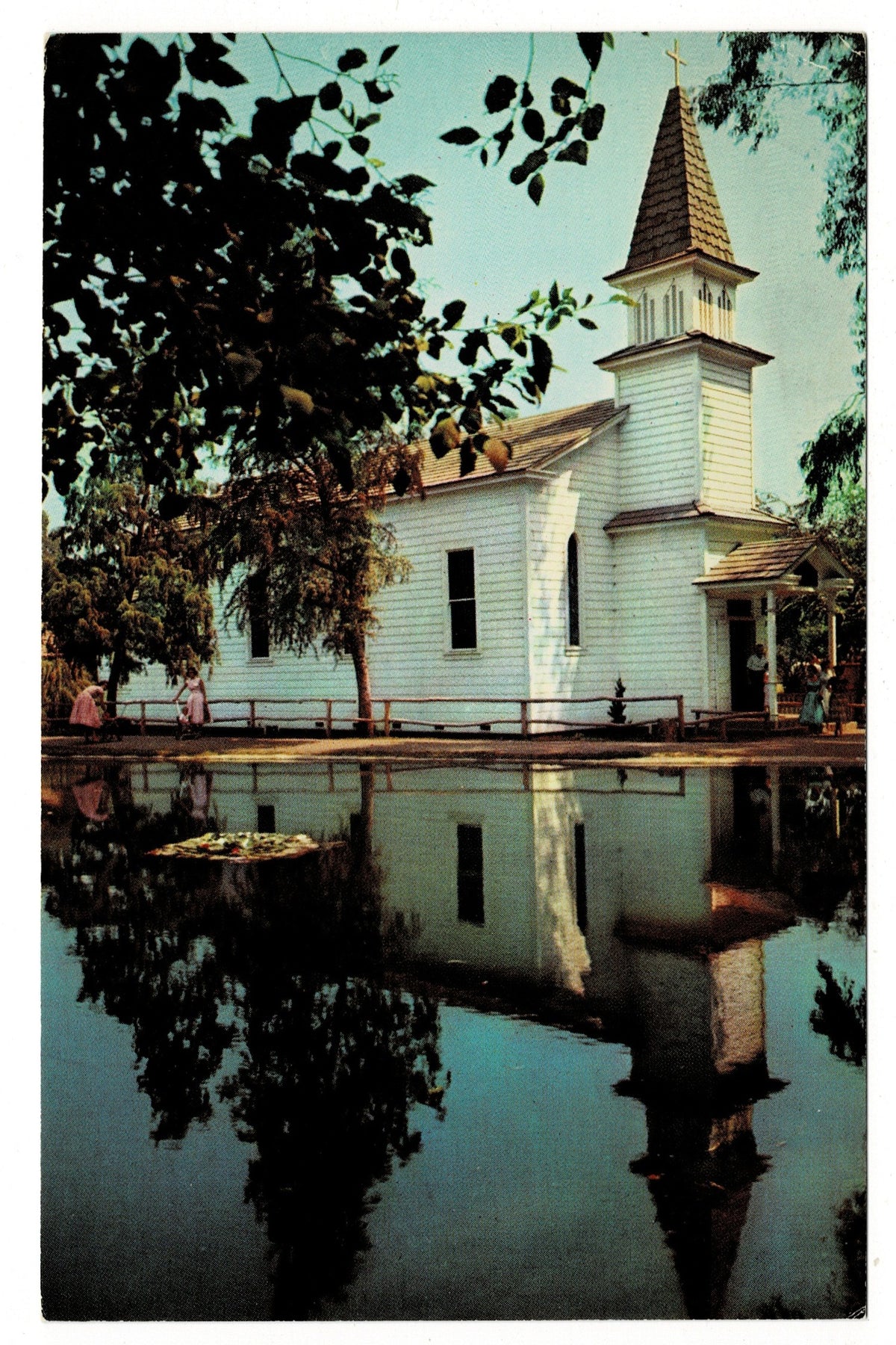 The postcard captures the church in its classic setting behind a low wooden fence, its white façade and square bell tower topped with a tapered dark steeple and cross mirrored perfectly in Reflection Lake. Lush green trees frame the scene, with a small family strolling near the entrance, giving a sense of timeless charm and peacefulness within the lively theme park.