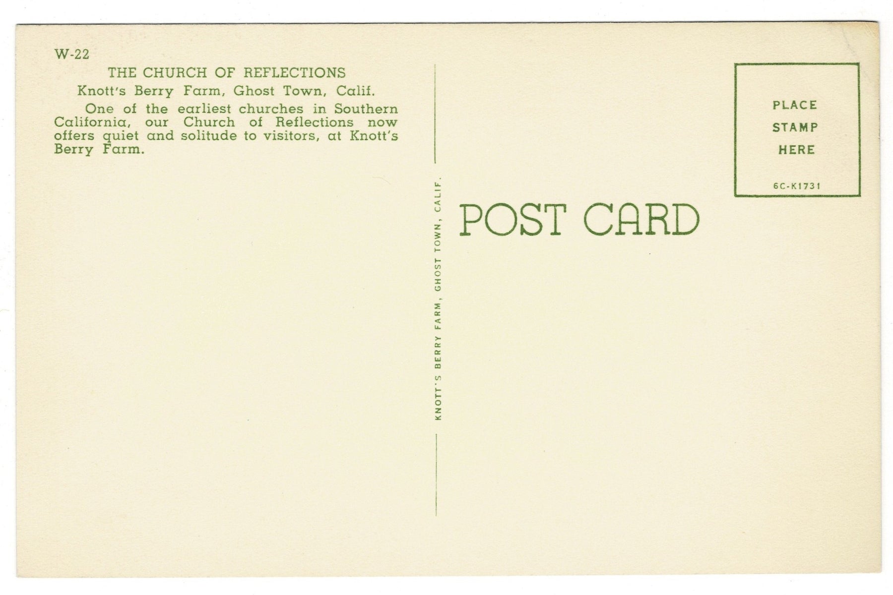 This card preserves the church as it appeared in mid-20th-century Knott’s Berry Farm, highlighting both its frontier-inspired architecture and its role as a “living” landmark where visitors could pause for reflection or celebrate weddings. The image serves as a vivid keepsake of Southern California history, the vision of Walter Knott, and the enduring allure of one of the region’s most iconic preserved structures.