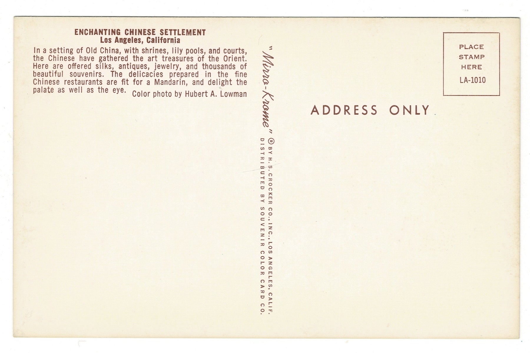 The scene reflects the early years of modern Chinatown, which opened in 1938 after the demolition of Old Chinatown to build Union Station. This postcard features a color photograph by Hubert A. Lowman in the Mirro-Krome series and was distributed by H. S. Crocker Company, Inc. for Souvenir Color Card Co.