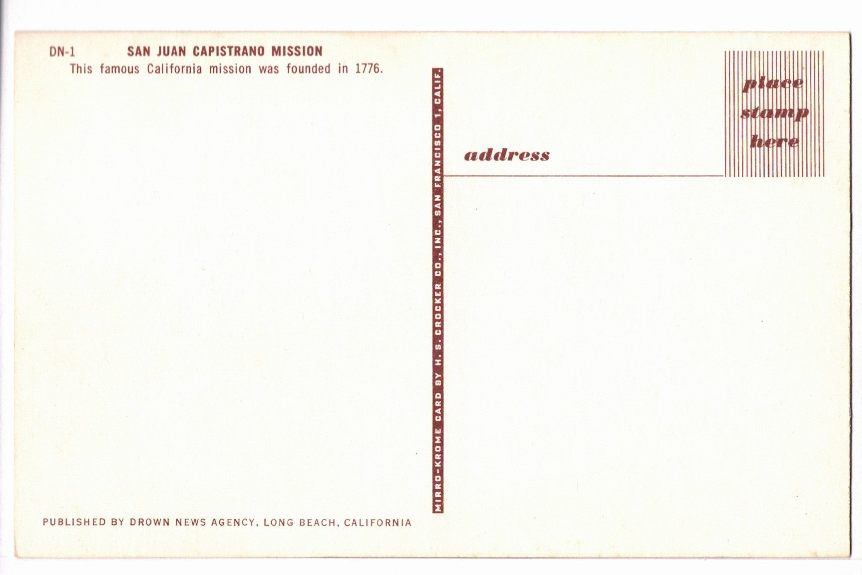 This postcard was published by Drown News Agency of Long Beach, California, and printed as a Mirro-Krome card by H.S. Crocker Co., Inc., San Francisco, known for its vivid photographic reproductions and mid-century postcard craftsmanship.