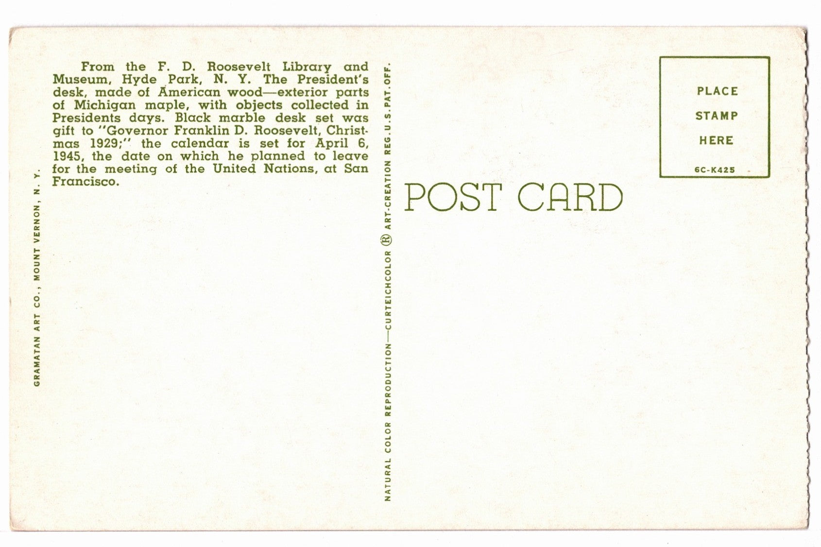 This postcard was published by Gramatan Art Company of Mount Vernon, New York, and printed using Curteichcolor natural color reproduction. It is highly prized by collectors for its vivid, enduring color and the exquisite craftsmanship that brings both the textures of the room and the historical details to life.