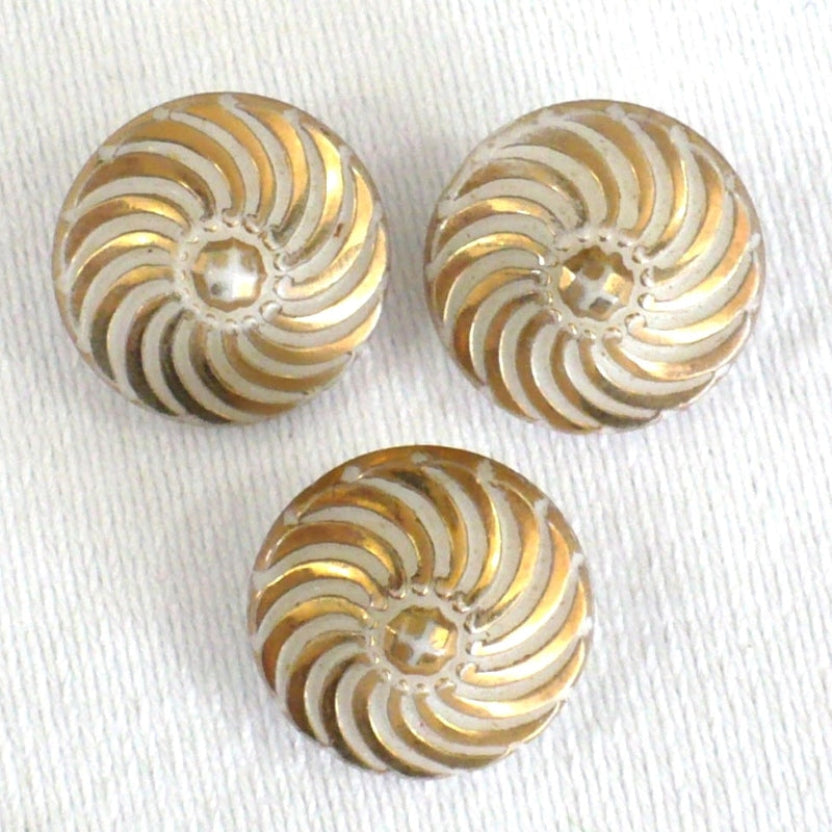 29L Set of Three 1950s Small White & Gold Pinwheel Czech Glass Buttons, 3/4"
