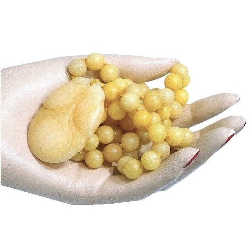 This 1970s vintage Chinese export necklace is a rare artifact from a pivotal moment in modern history. The pendant, a finely hand-carved persimmon fruit rendered in warm yellow nephrite jade, reflects the quiet return of traditional artistry following a decade of cultural erasure. During Mao Zedong’s Cultural Revolution, artists were banned, workshops were shuttered, and centuries-old techniques were driven underground. Traditional motifs like this, rich in symbolism and tied to heritage, were forbidden.