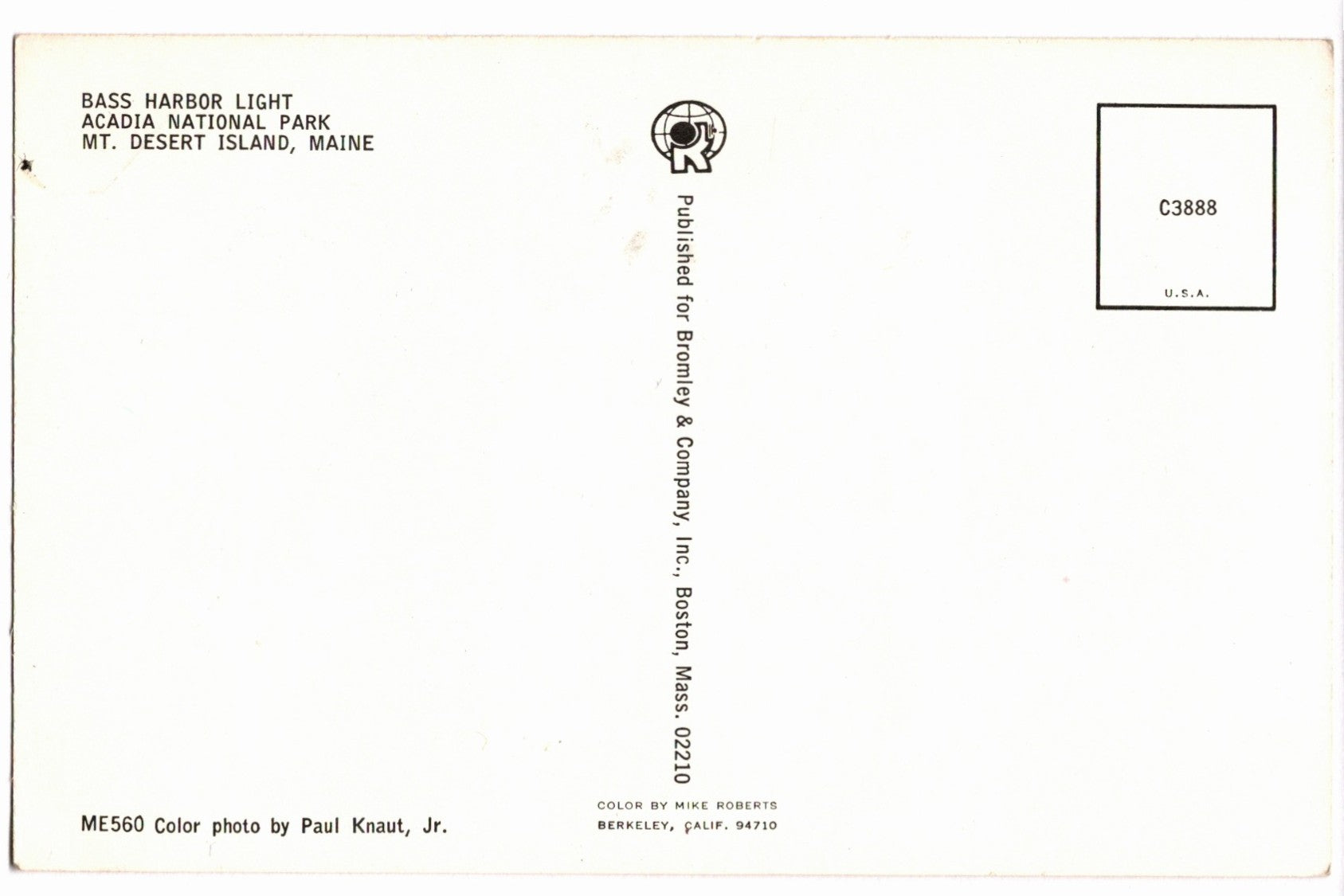 This postcard features color photography by Paul Knaut Jr. and was produced by Mike Roberts Color Productions of Berkeley California. Published for Bromley and Company Inc. of Boston Massachusetts, the card reflects the rich natural color and scenic clarity that distinguish mid century Mike Roberts postcards.