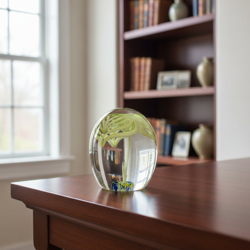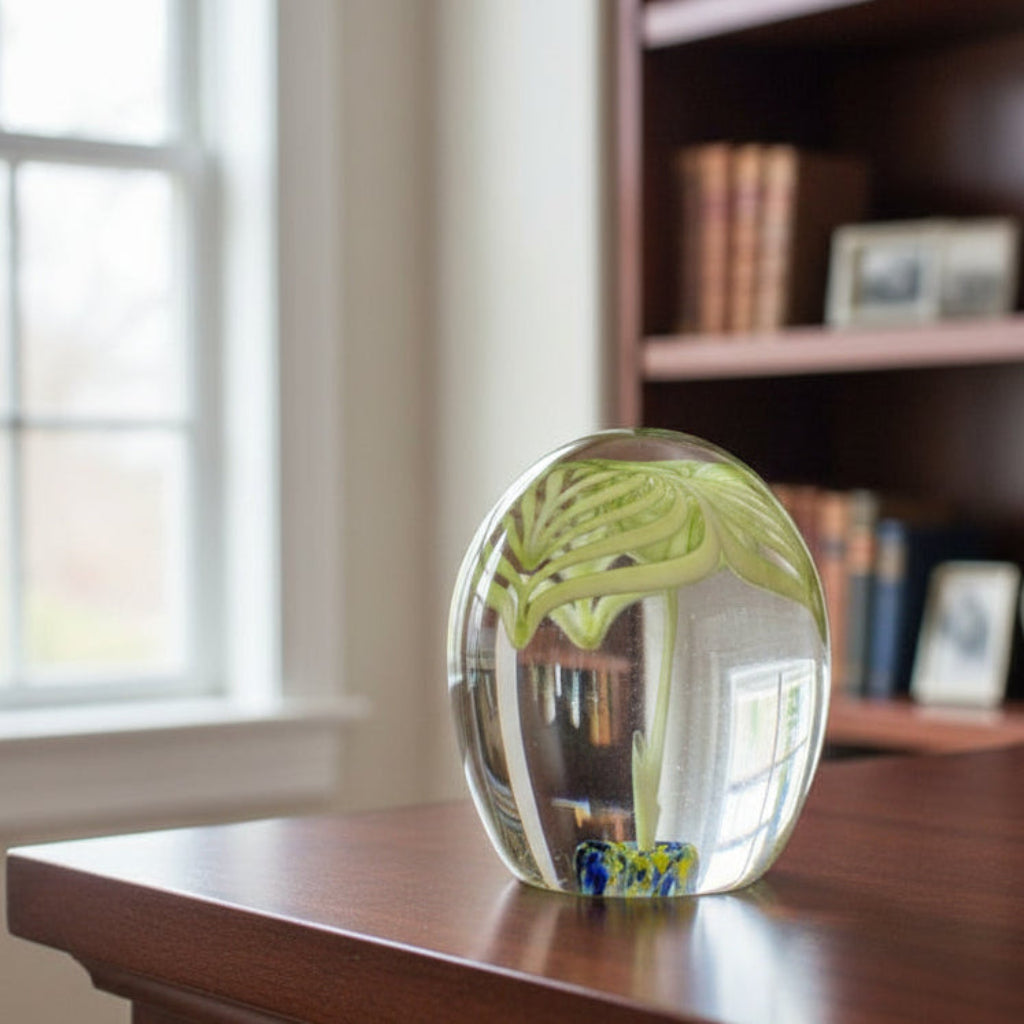 This beautiful Mid-Century art glass paperweight from Argentina features a single delicate flower encased in crystal-clear glass, signed Querandi, 342. Its soft, warm yellow tone and elegant form make it a striking decorative piece, ideal for collectors or anyone looking to add a unique vintage accent to their home or office.