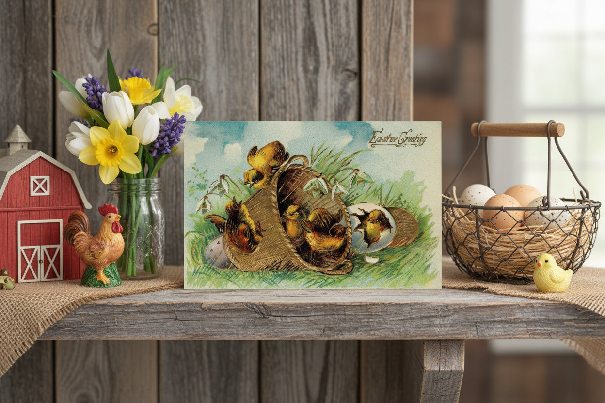 1908 vintage postcard. A gilded basket filled with cheerful baby chicks hatching from Easter eggs. A darling Spring scene. Gilded. Embossed. "Easter Greeting". This card would be adorable in an Easter basket, framed as a holiday keepsake, or make an excellent addition to any collection.