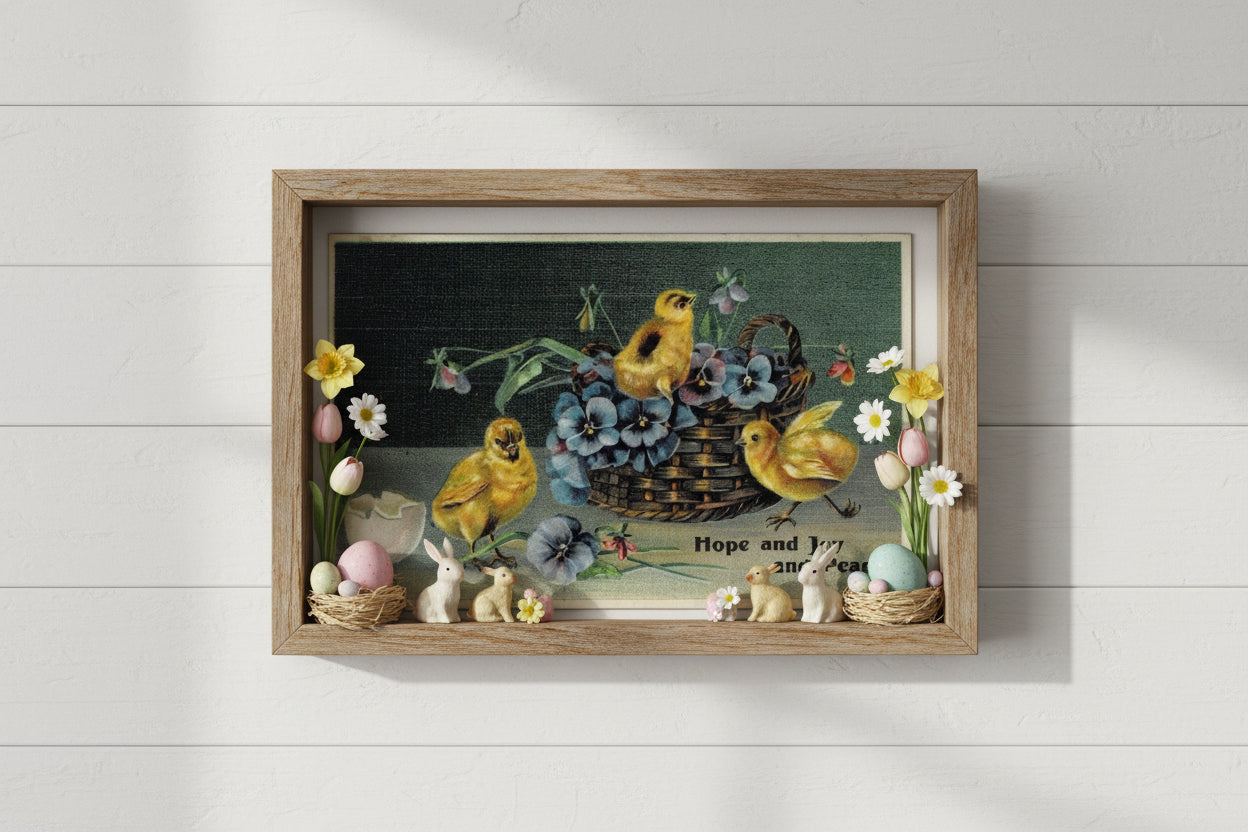 1908 vintage postcard. A positively charming antique Easter greeting, Sweet baby chicks, eggs, and a basket of blooming violets. "Hope and Joy and Peace" greeting. Embossed. This card would be adorable in an Easter basket, framed as a holiday keepsake, or make an excellent addition to any collection.
