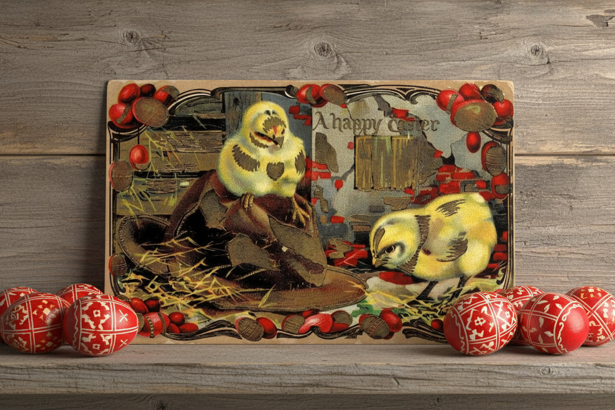 1911 vintage postcard. Bright yellow baby chicks frolic in a gilded farm scene, Rich colors. Gilded. Embossed. "A Happy Easter" greeting.