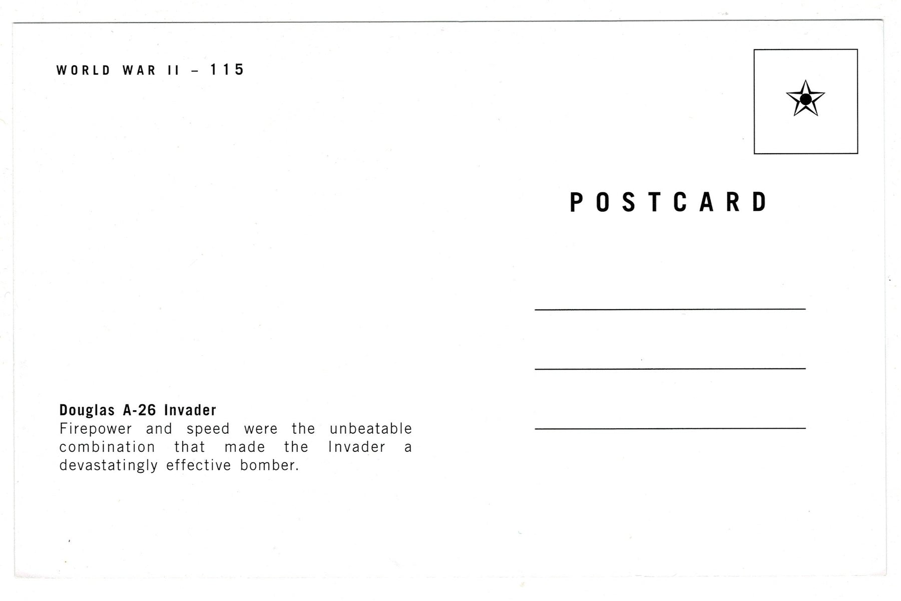 Experience the raw speed and striking power of World War II aviation with this collectible postcard featuring the formidable Douglas A-26 Invader.