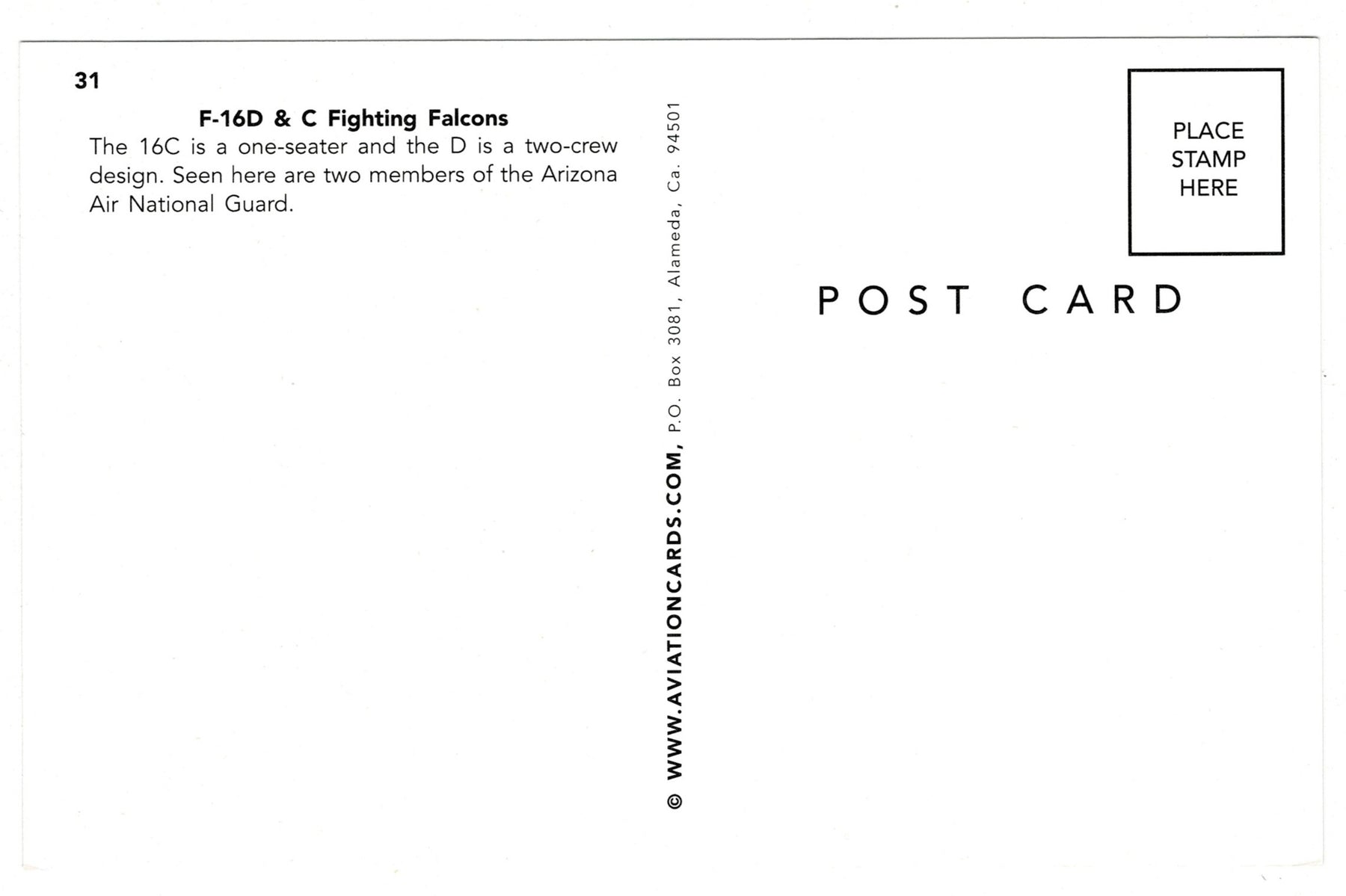 F-16D & F-16C Fighting Falcons – Arizona Air National Guard postcard, back vew.