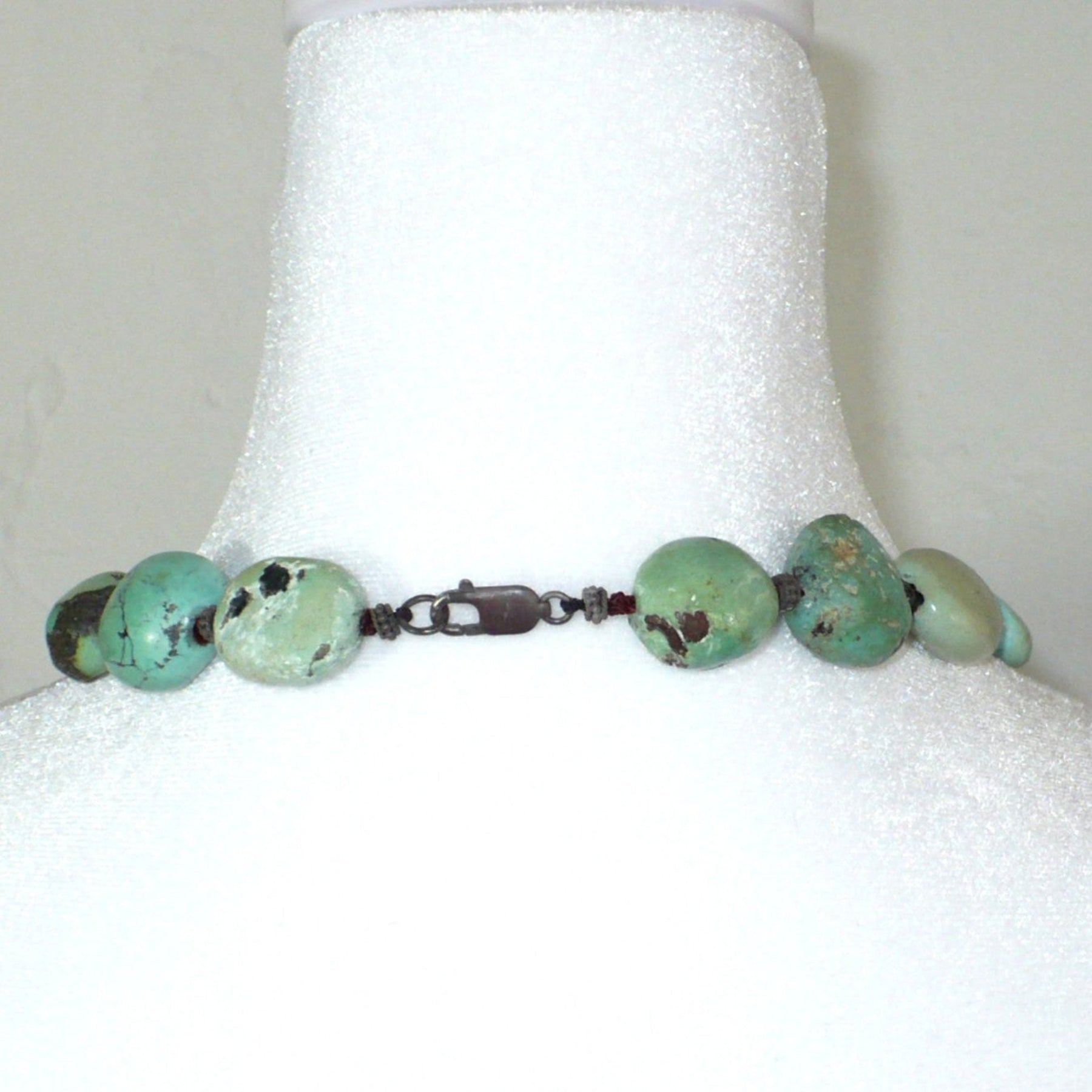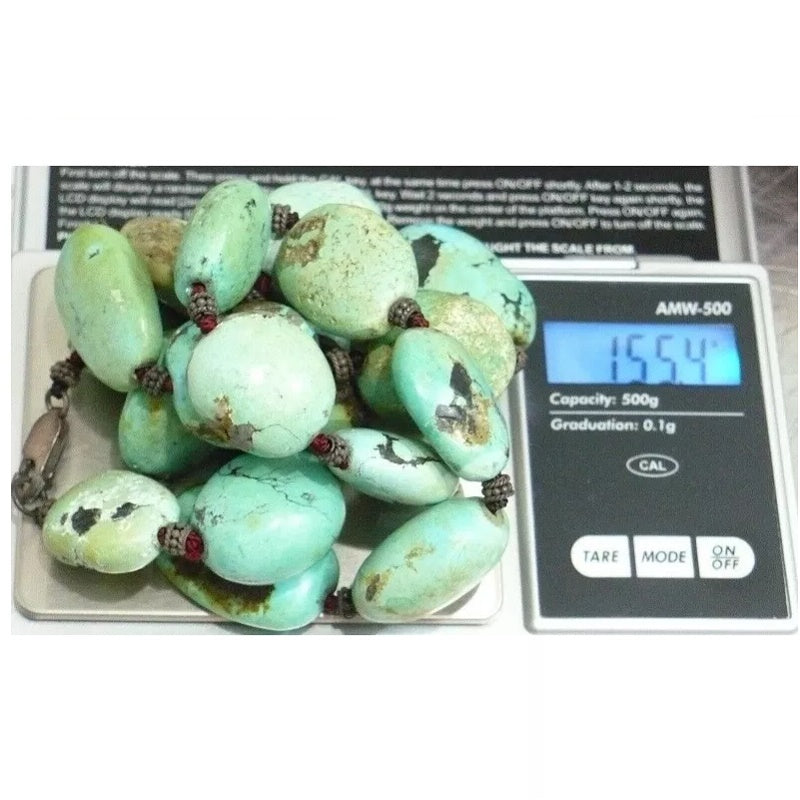 1970s vintage chunky Hubei Turquoise beaded statement necklace. Each chunky bead showcases the natural beauty of Hubei Turquoise. The vibrant blue-green hues evoke the serene December birthstone, while the silver spacer beads and 925 sterling silver lobster claw clasp add a touch of elegance. With a single strand and matinee length of approximately 25 inches, this necklace is a true statement piece. Wear it proudly and embrace the timeless allure of genuine gemstones.