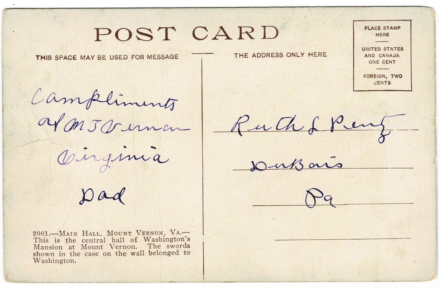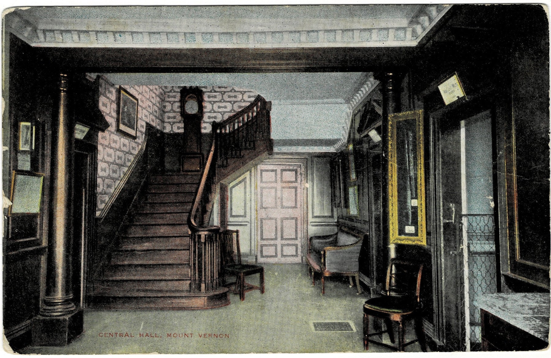 This 1910 halftone postcard features the stately Main Hall of Mount Vernon, Virginia, the beloved home of George Washington. With its graceful archways, rich woodwork, and period furnishings, the hall was the heart of the mansion, welcoming guests from across the colonies and beyond. By the early 20th century, Mount Vernon had become a cherished historic site, preserved through the efforts of the Mount Vernon Ladies' Association—the first national organization to save a historic home in the United States. The halftone printing lends the image a soft, timeless quality, echoing the quiet dignity of Washington’s legacy.