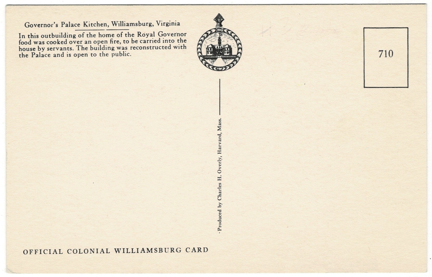 Produced by Charles H. Overly of Harvard, Massachusetts, for the Colonial Williamsburg Foundation, this official Colonial Williamsburg postcard is an unused, uncirculated collectible. It preserves a charming glimpse into reconstructed colonial life, making it a desirable keepsake for collectors of historic Williamsburg souvenirs, early American art, and mid-20th-century museum postcards. This postcard would look great framed, make a wonderful hostess gift, or make an excellent addition to any collection.