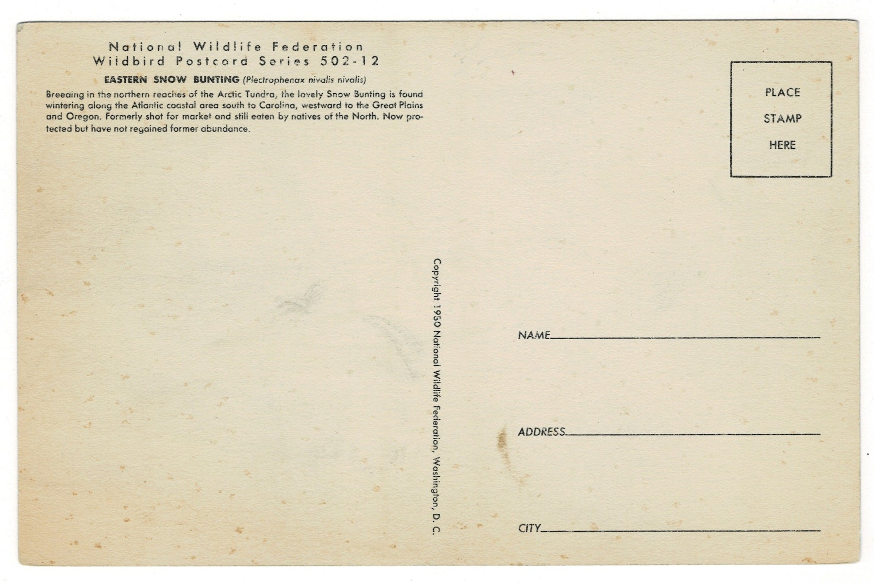 When winter winds sweep across open fields and the landscape turns to silver and white, a small, hardy bird flutters low over the snow like a drifting snowflake. This vintage National Wildlife Federation postcard captures that stark, beautiful moment. An Eastern Snow Bunting poised against a wintry backdrop, its pale plumage blending softly with the season it calls home. The scene feels crisp and quiet, evoking wide northern skies and the peaceful stillness of winter’s open country.