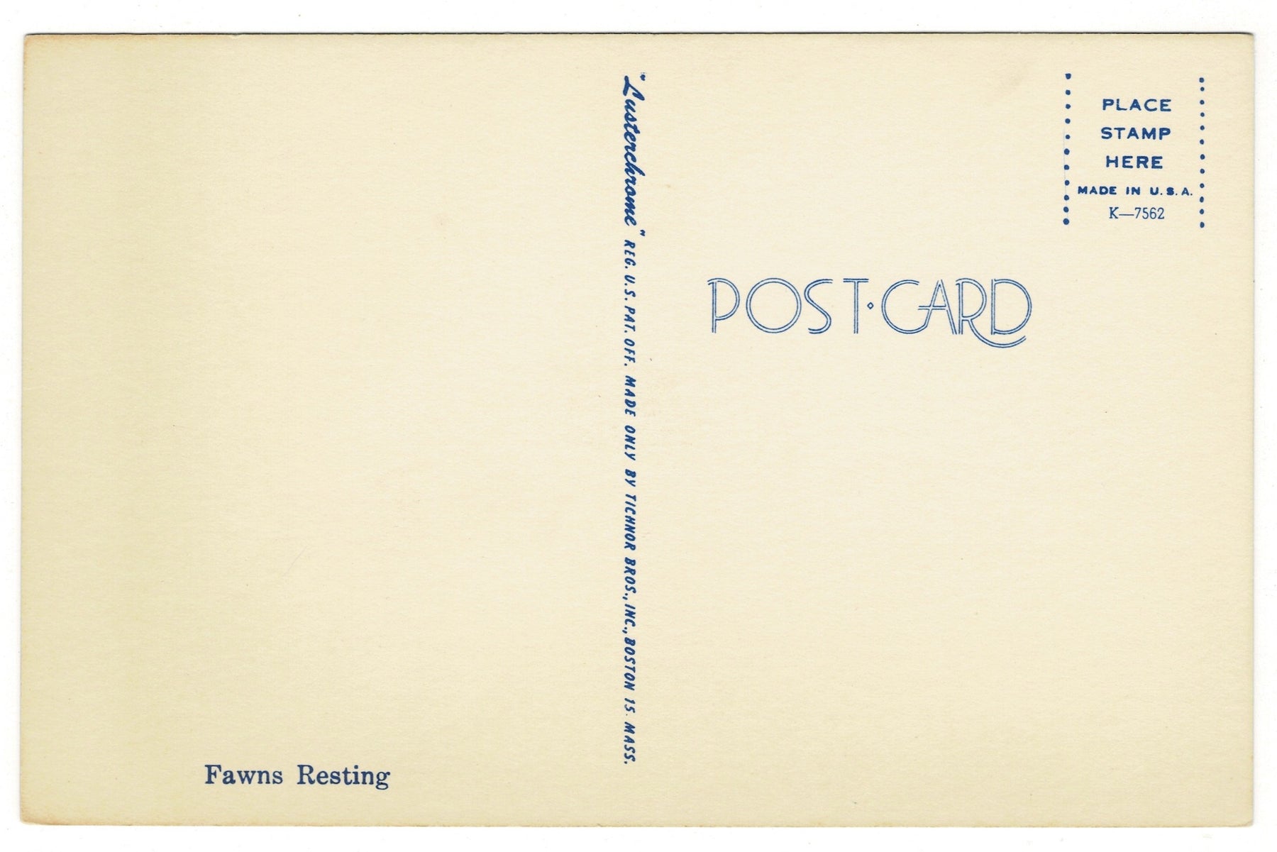 This postcard was produced during the chrome era by Tichnor Bros., Inc., Boston, Massachusetts, with a luster finish that enhances the vibrant colors and fine detail of the scene. The fawns are white-tailed deer, a species known for their early “hider” behavior, where newborns spend their first few weeks resting quietly while their mothers forage, emerging to follow them after about a month.