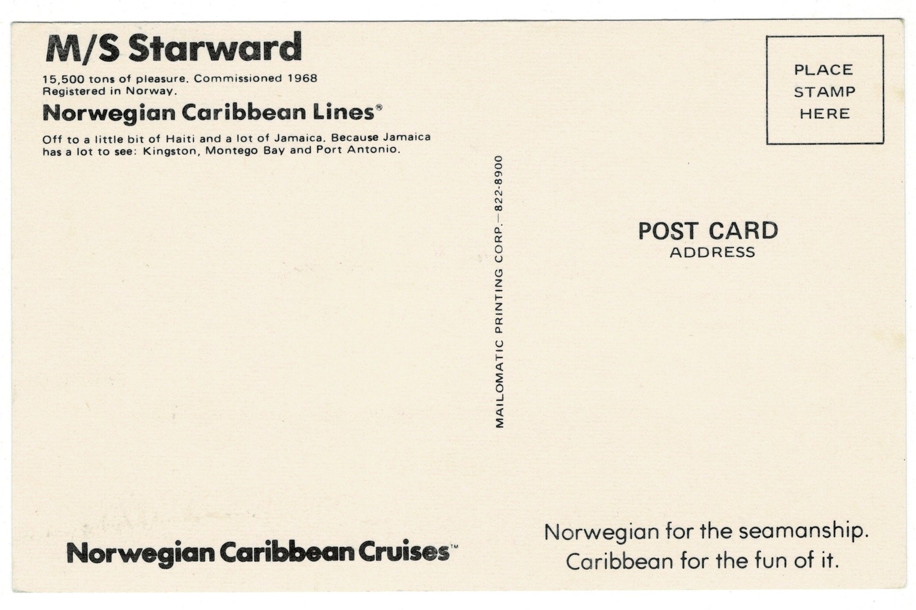 Step aboard a piece of cruising history with this vintage postcard featuring the MS Starward of the Norwegian Caribbean Line. Launched in 1968 from Bremerhaven, West Germany, the Starward was a pioneering vessel in modern Caribbean cruising, offering passengers a stylish and adventurous way to explore the islands.