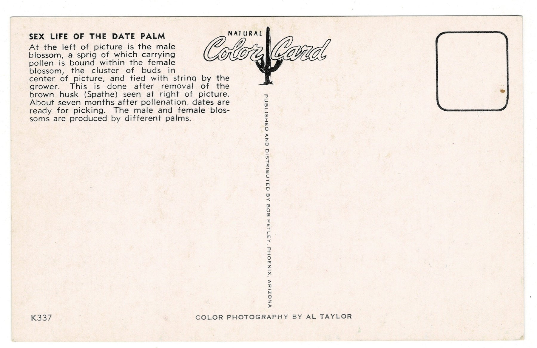 Produced as a Natural Color Card, this postcard was published and distributed by Bob Petley of Phoenix, Arizona, known for distinctive mid-century Southwestern postcard production. Color photography by Al Taylor gives the image crisp detail and vivid clarity, characteristic of quality chrome-era cards. This piece is especially appealing to collectors of agricultural history, botanical subjects, desert farming, or educational novelty postcards from the American Southwest.