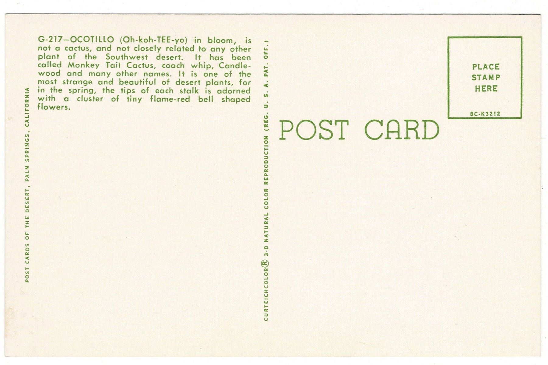 Known by many names, including Monkey Tail, Coach Whip, and Candle-wood, the Ocotillo has long fascinated desert travelers for its unusual form and sudden bursts of beauty. Photographed in rich color and reproduced using CurteichColor 3-D natural color techniques, this postcard preserves the striking contrast between the vivid flowers and the spiny, sculptural stems, making it a captivating collectible for those enchanted by Southwestern flora, desert landscapes, and mid-century botanical imagery