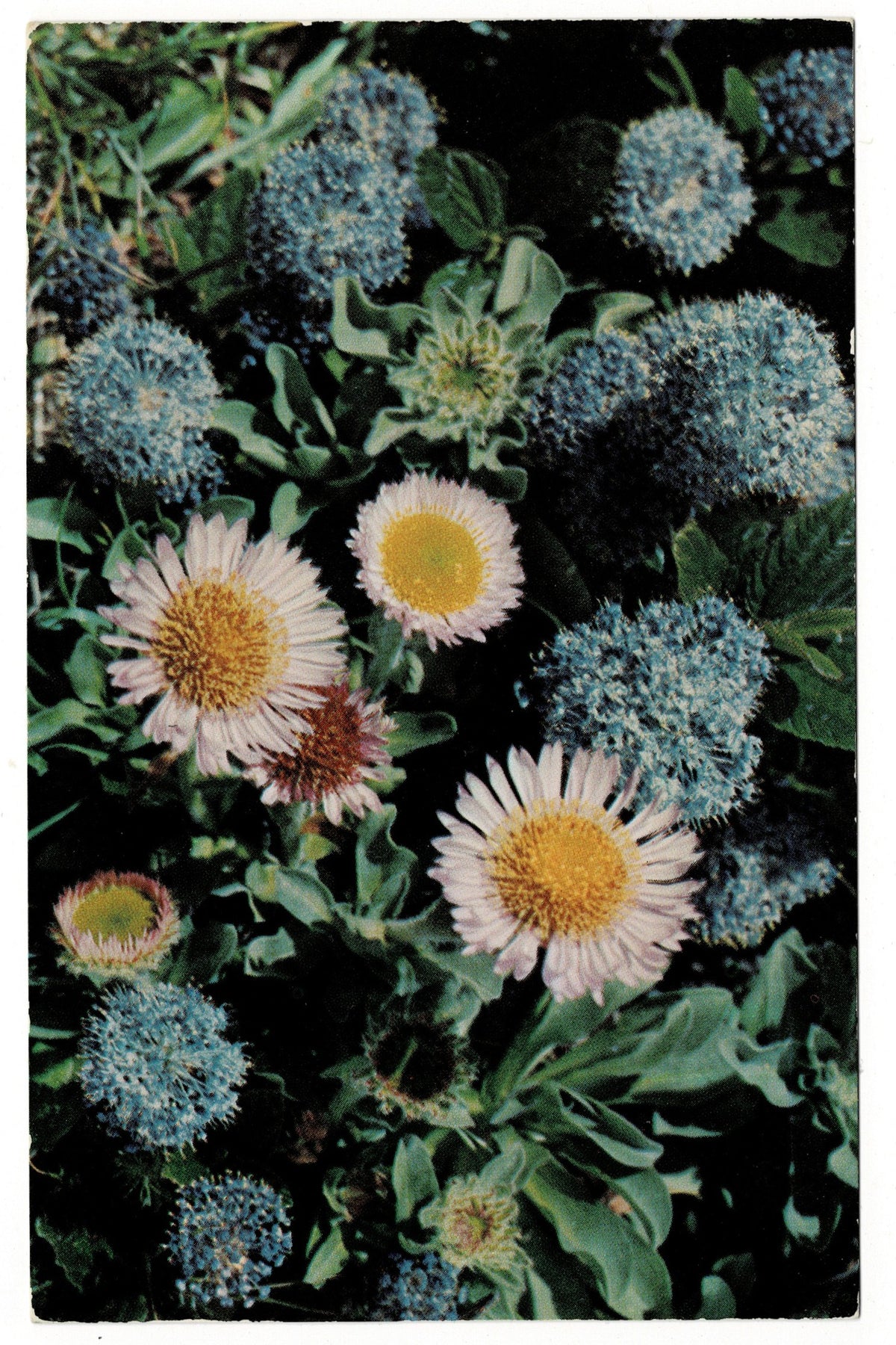 Imagine holding a vibrant piece of the coast in your hands, where delicate sea asters bloom with daisy-like petals in shades of white to soft lavender, their sunny yellow centers dancing alongside the dense, globe-shaped clusters of wild lilac. This vintage postcard captures that fleeting, serene beauty, inviting you to linger on the textures, colors, and quiet elegance of these hardy, sun-loving flowers. There is a gentle romance in the scene: a harmony of blooms that promises calm, inspiration, and a connection to nature’s subtle artistry.