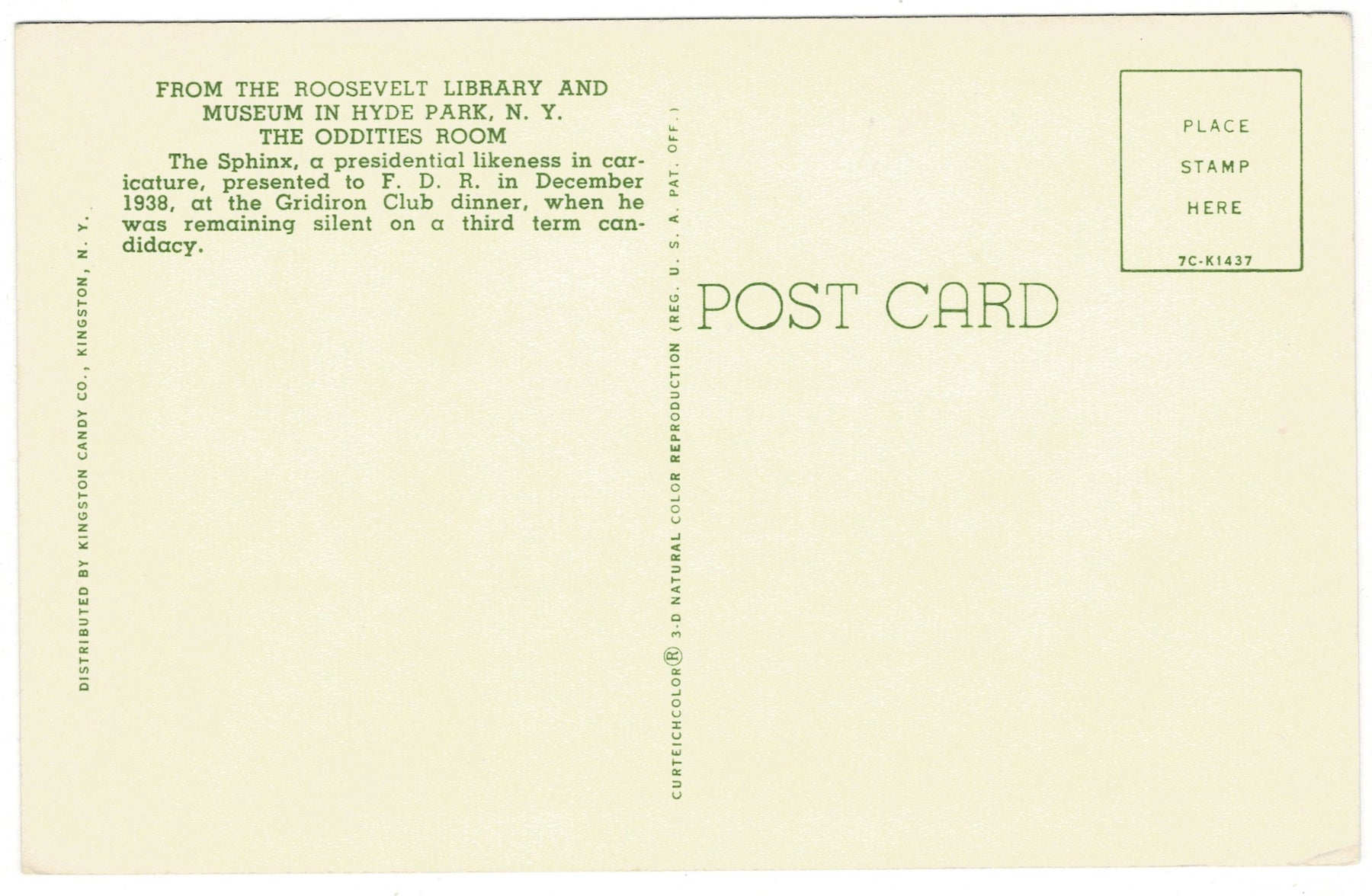The centerpiece of the image is the Sphinx sculpture, portraying President Roosevelt with his unmistakable glasses, strong chin, and trademark cigarette holder. Created by political cartoonists in December 1938, the sculpture symbolized FDR’s “mysterious” silence regarding a possible third-term candidacy. Roosevelt reportedly enjoyed the caricature so much that he requested it for display at his presidential library in Hyde Park, New York. The postcard also shows other unique objects in the room, including a totem pole, ceremonial items, and framed memorabilia, reflecting the eclectic gifts and artifacts housed there.