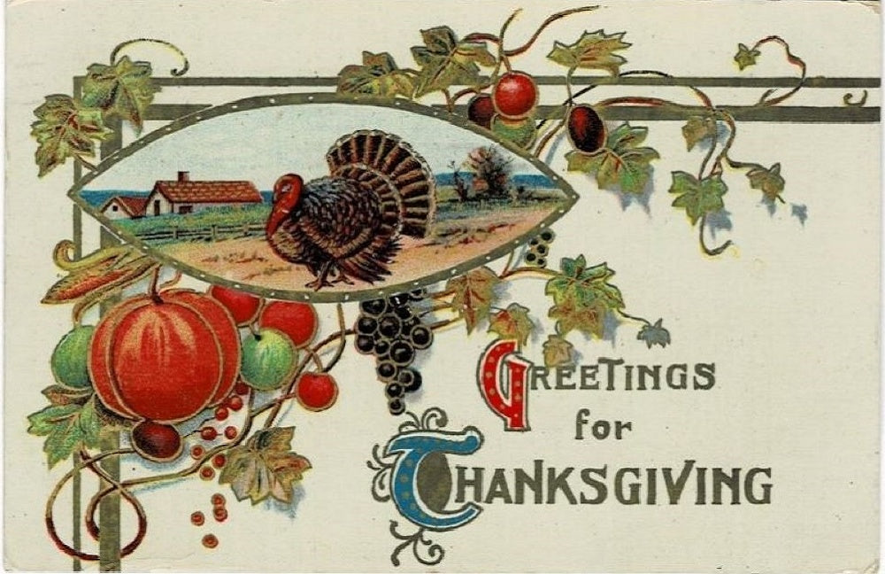 1911. A truly beautiful antique holiday postcard. The combination of a pastoral scene, a majestic Tom turkey, and a harvest and vine motif creates a truly enchanting visual experience. "Greetings for Thanksgiving" is written in an illuminated script, adding a touch of elegance and timelessness to the greeting.