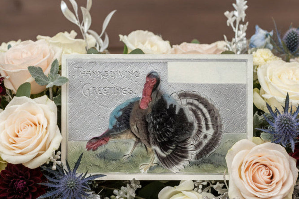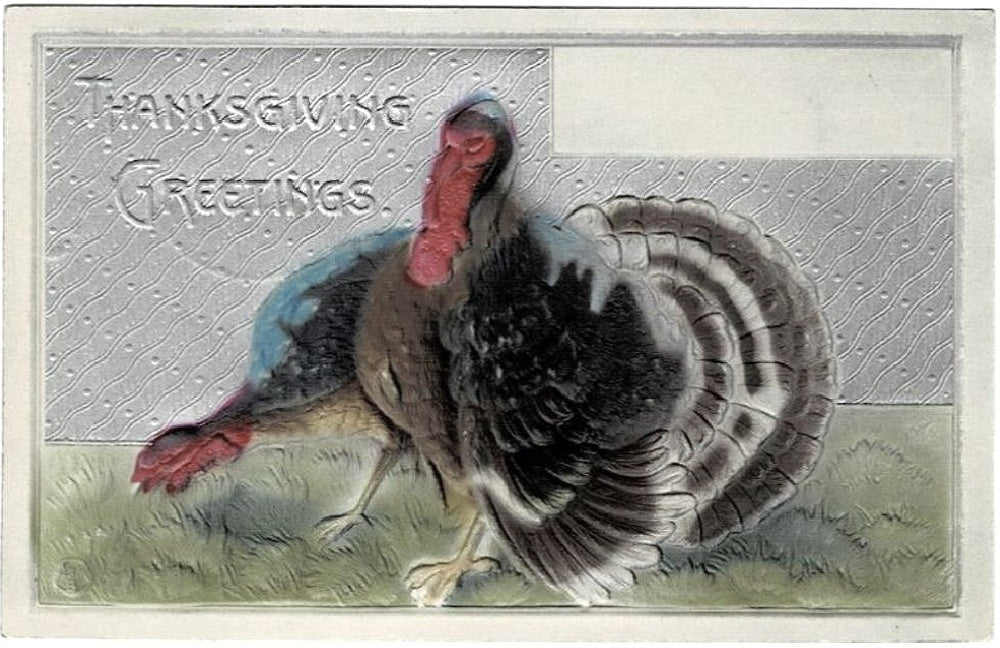 1916. This card features a stunning metallic color palette that shimmers beautifully in the light. It is richly embossed, adding a touch of elegance. On the front, you'll find a proud Tom turkey and hen standing on lush green grass. The background is shiny silver, with an unused blank panel in the upper right corner, ready for your personal message. The card is further enhanced with metallic tones, adding a touch of opulence.