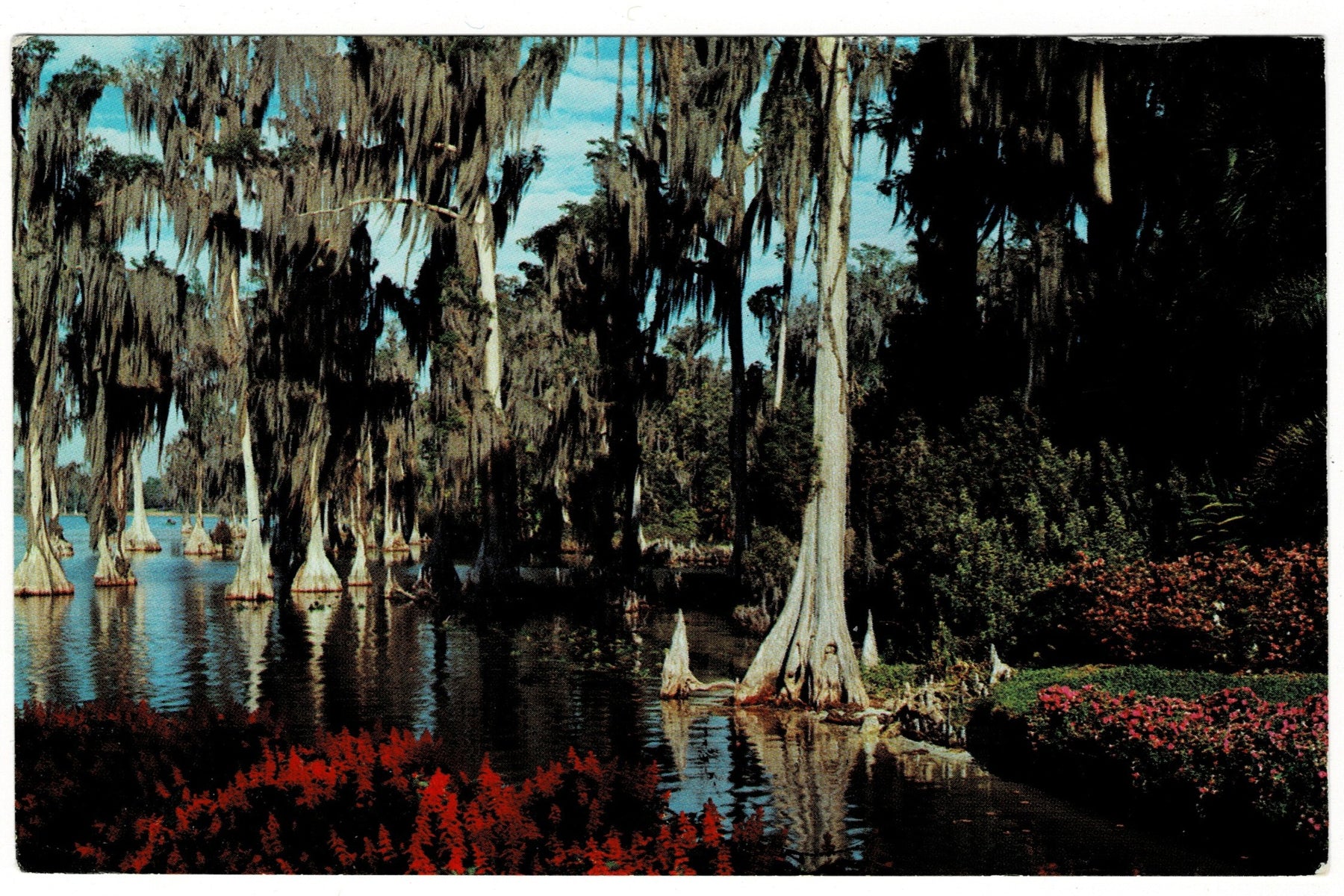 Titled “Lake Eloise at Cypress Gardens, Florida,” the postcard showcases the iconic scene of bald cypress trees growing directly in the water, surrounded by brilliant blooms. Distinctive cypress knees rise around the bases of the trees, providing both structural support and a unique visual element. The lush composition reflects the charm of Cypress Gardens, Florida’s first theme park, famous for its botanical beauty and water ski shows, and highlights the natural grandeur that attracted tourists for decades.