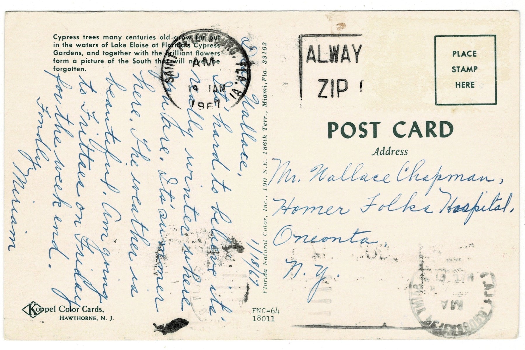 Produced by Koppel Color Cards of Hawthorne, New Jersey, and distributed by Florida Natural Color, Inc. of Miami, the postcard displays the vibrant colors and crisp detail typical of Chrome-era prints. This example was postmarked 1967, preserving a mid-century snapshot of one of Florida’s most celebrated botanical landmarks.