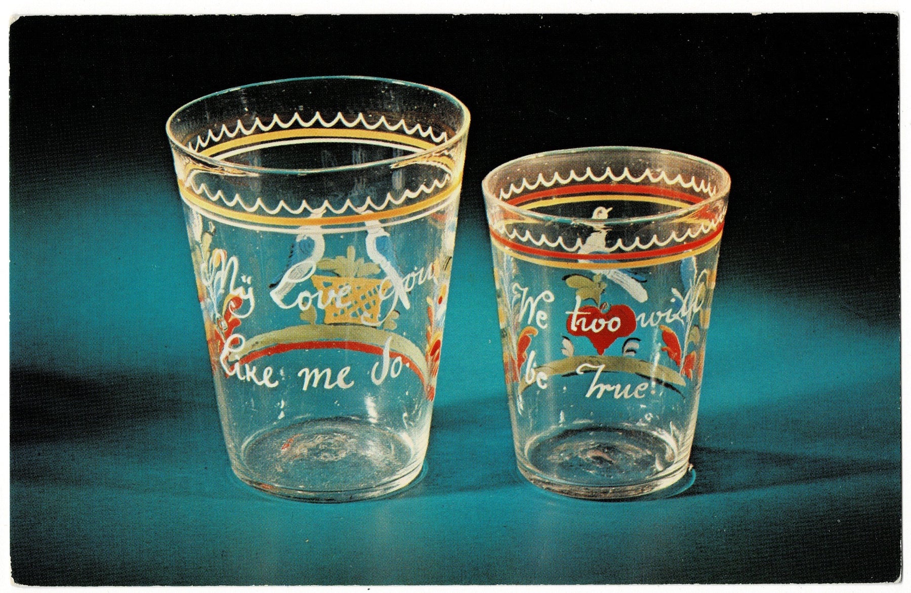 Charming and deeply romantic, this vintage postcard features two Stiegel-type tumblers decorated in lively peasant-style enameling. The blown glass forms are animated with hand-painted designs and heartfelt inscriptions that capture the spirit of early American courtship.