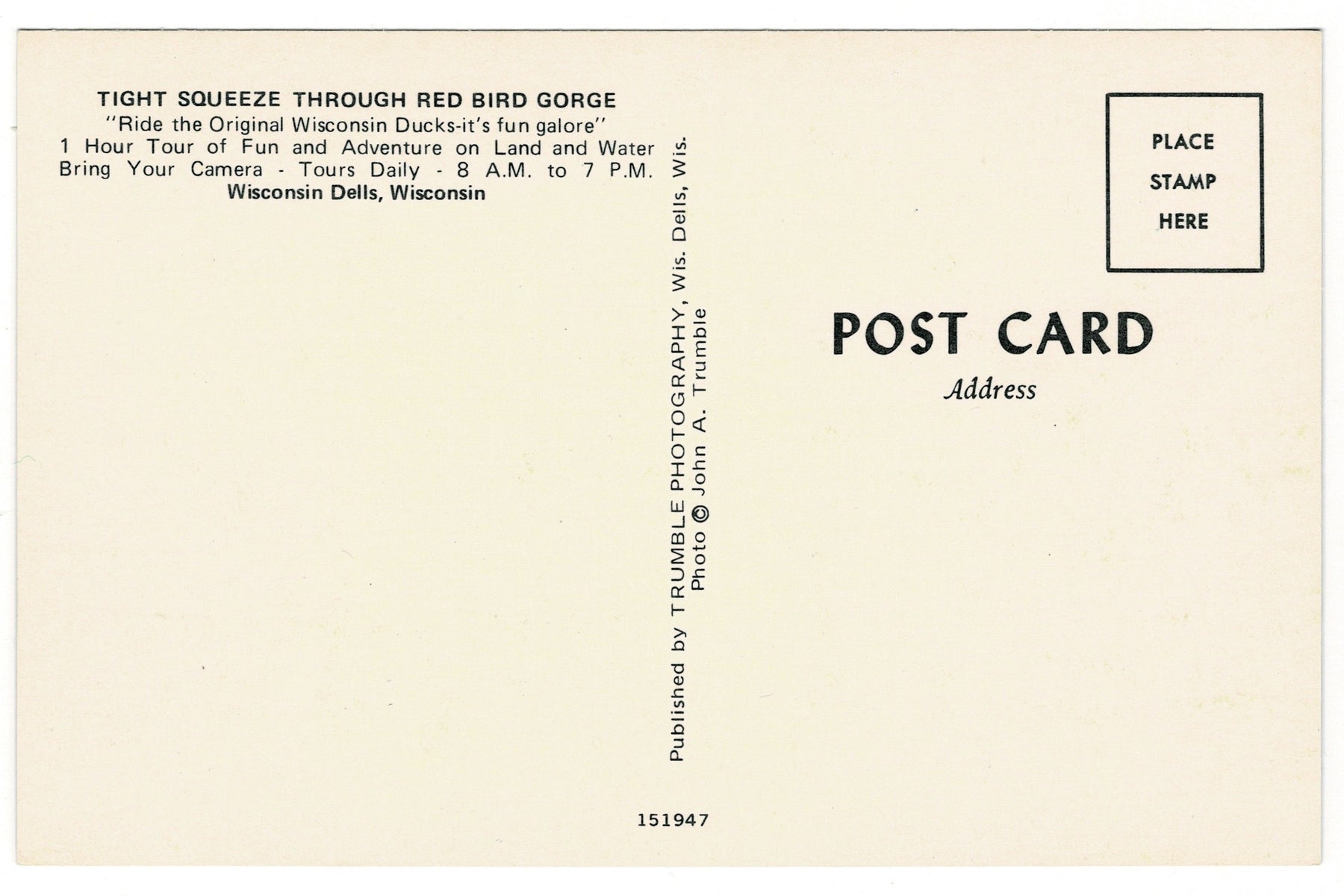 Feel the thrill of adventure with this vintage postcard capturing a “tight squeeze” through Red Bird Gorge on the Original Wisconsin Ducks tour in Wisconsin Dells. The image freezes an exciting moment as an amphibious Duck boat carefully navigates between towering Cambrian sandstone cliffs, their rugged walls rising dramatically on either side. The narrow passage highlights both the skill of the driver and the breathtaking geology that has made the Dells a beloved destination for generations.