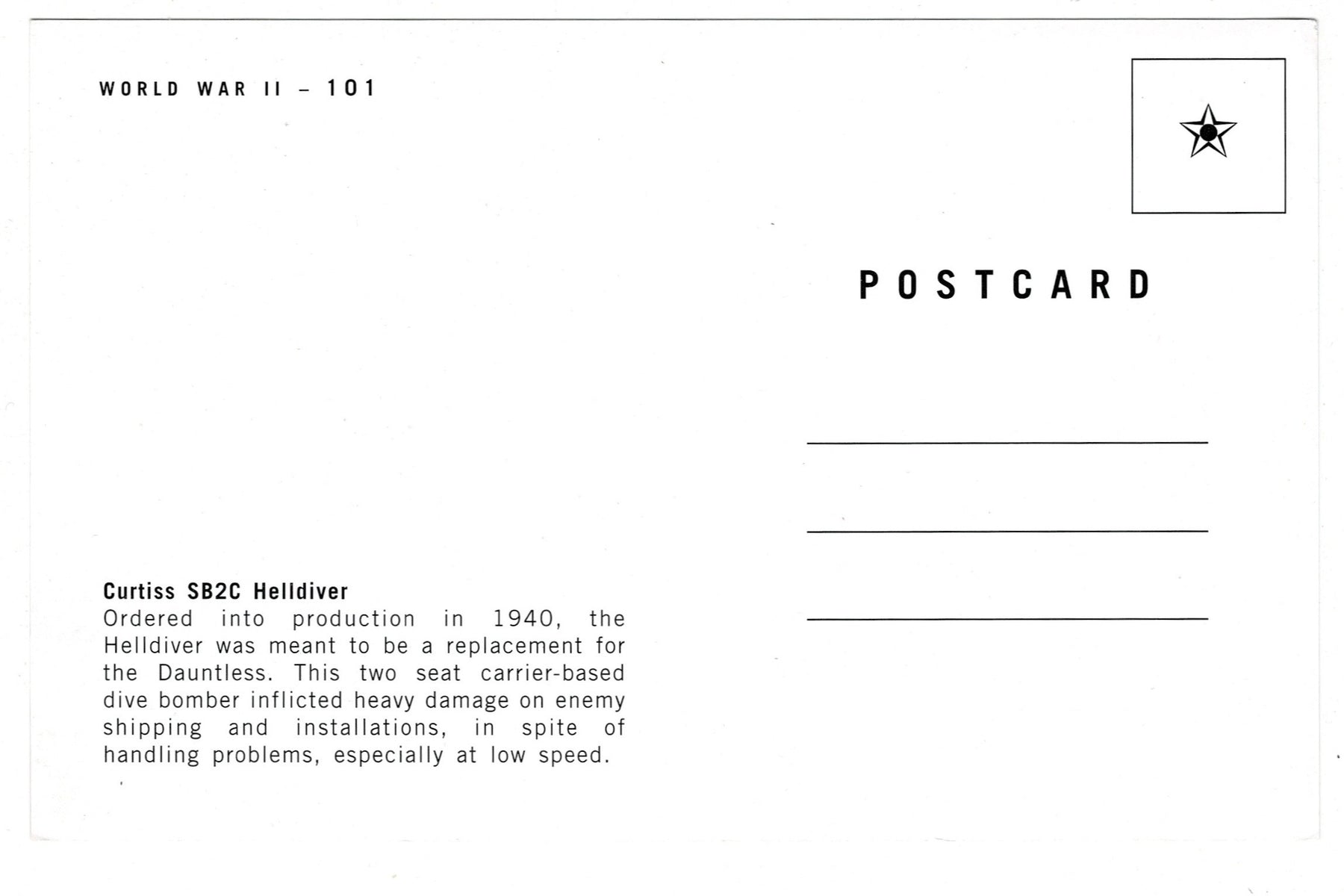 Experience the thrill and drama of World War II aviation with this striking collectible postcard of the legendary Curtiss SB2C Helldiver.