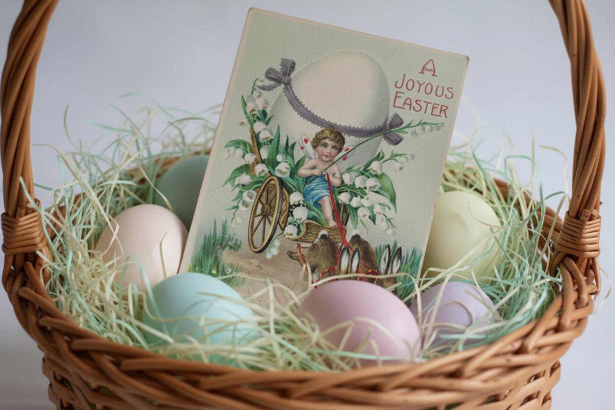 This charming 1909 embossed vintage postcard features a beautifully detailed scene: a large Easter egg being delivered in a wicker cart by a winged fairy, while two brown jackrabbits pull the cart. The rich colors and exquisite details make it a delightful piece. It bears the greeting "A Joyous Easter," making it perfect for framing as a holiday keepsake, adding to an Easter basket, or incorporating into any collection.