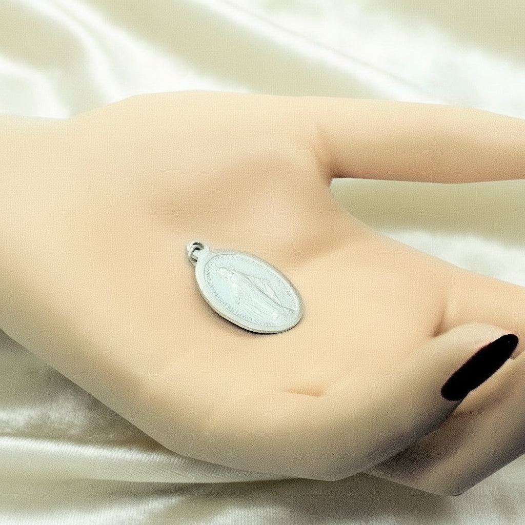 Discover a rare piece of history with this late-1940s Miraculous Medal, crafted from lightweight eloxal aluminum. Crafted during World War II, when gold and silver were reserved for the war effort, this medal reflects the material innovation of the late 1930s to early 1940s. Eloxal was prized for its durability, bright finish, and corrosion resistance, qualities that made it both practical and stylish at a time when metal resources were limited