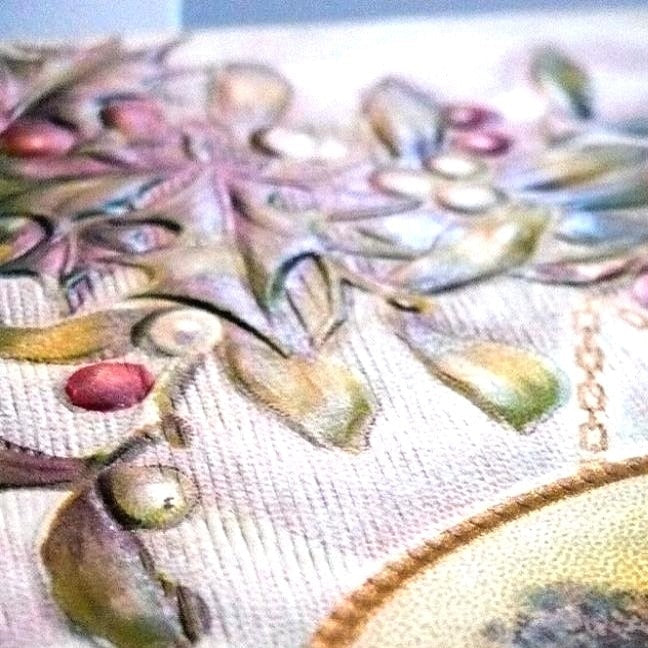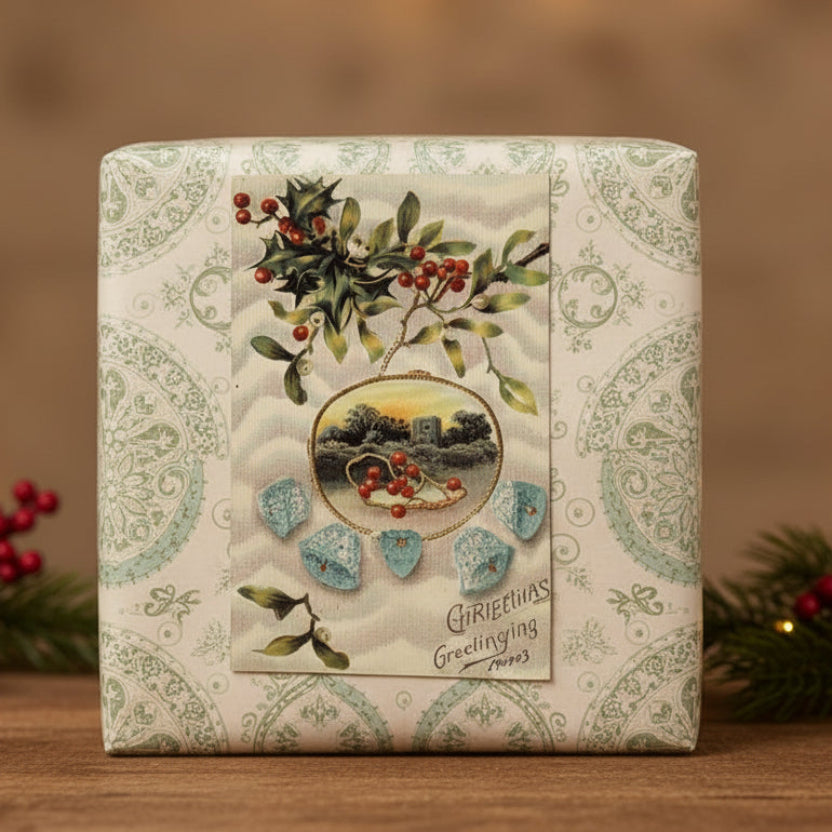 Featuring a charming winter scene, this card showcases an illustrated Victorian brooch adorned with embossed chains and unique enameled blue and white floral bells. The brooch is set against a luxurious watered silk background, topped with sprigs of holly and mistletoe, symbols of everlasting love. Perfect for framing or adding to your collection, this card is a timeless piece of holiday cheer.