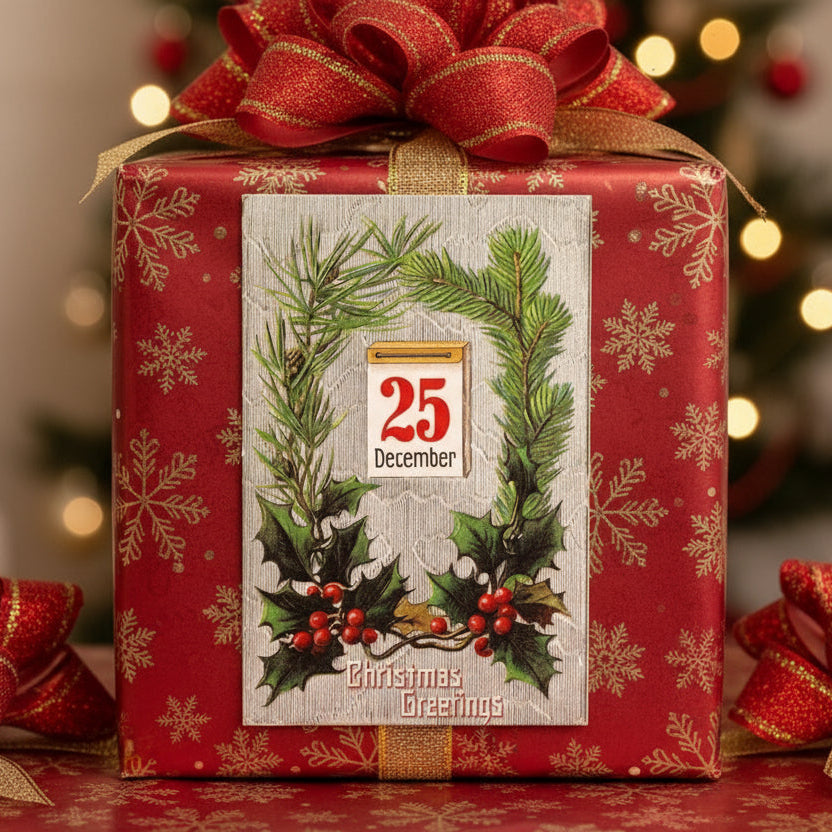 1909. Breathtakingly beautiful silver-gilded antique Christmas postcard. Embossed, lush holly and berries along with evergreen boughs frame a calendar that announces: "25 December, Christmas Greetings". This would look great framed or make a nice addition to any collection.