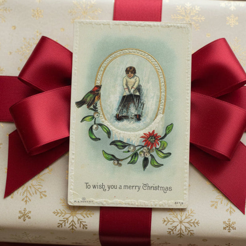 Feel the crisp winter air and the thrill of childhood joy with this charming 1912 embossed postcard, delicately framed in gilded touches. At its heart, a boy speeds downhill on a classic wooden sled, bundled in winter wear, cheeks flushed with excitement. The snowy scene is enclosed in a radiant gilded oval, flanked by a cheerful songbird and sprigs of mistletoe: symbols of warmth and goodwill during the holiday season.