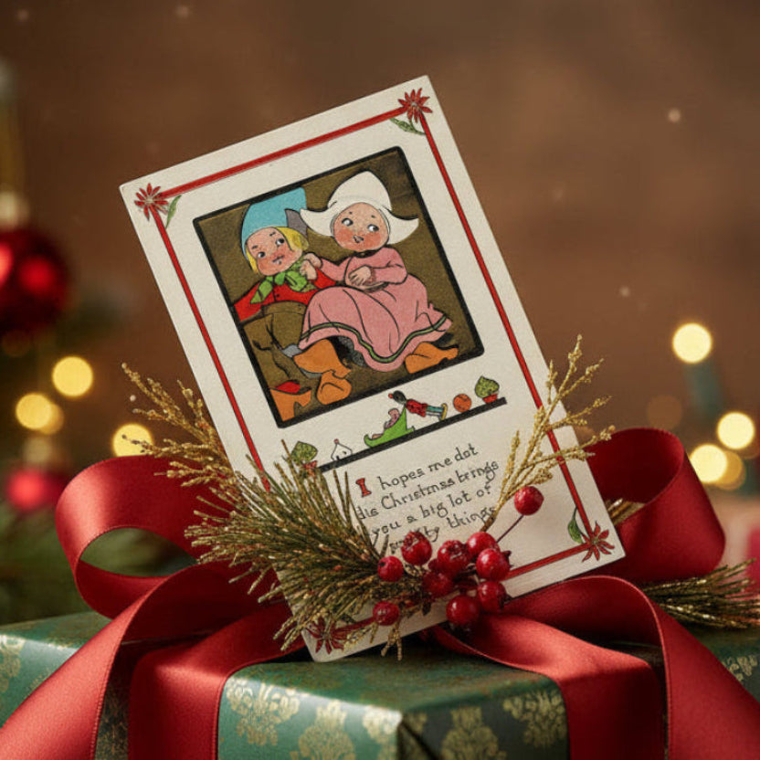 This charming 1913 vintage Christmas postcard features two daring children dressed in traditional Dutch attire, capturing the simplicity and warmth of a European holiday celebration. The boy, dressed in a blue hat, red jacket, brown pants, and clogs sits alongside the girl in a pink dress and white bonnet, also sporting wooden shoes. Their adorable expressions and the dark background enhance the nostalgic feel of this delightful holiday scene.
