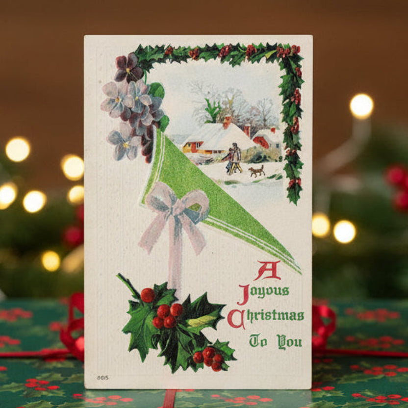 Step back in time with this enchanting 1913 vintage holiday postcard, featuring the heartfelt message, “A Joyous Christmas To You.” The scene captures a serene winter pastoral, where a couple strolls through the snow with their loyal dog, heading towards a cozy, snow-covered cottage that radiates the warmth of the holiday season. Delicate Forget-me-nots, symbolizing true love and devotion, add a touch of romance, while an embossed Holly border frames the scene, enhancing its timeless charm. Perfect for framing or as a distinguished addition to any collection, this postcard is a beautiful piece of holiday nostalgia.