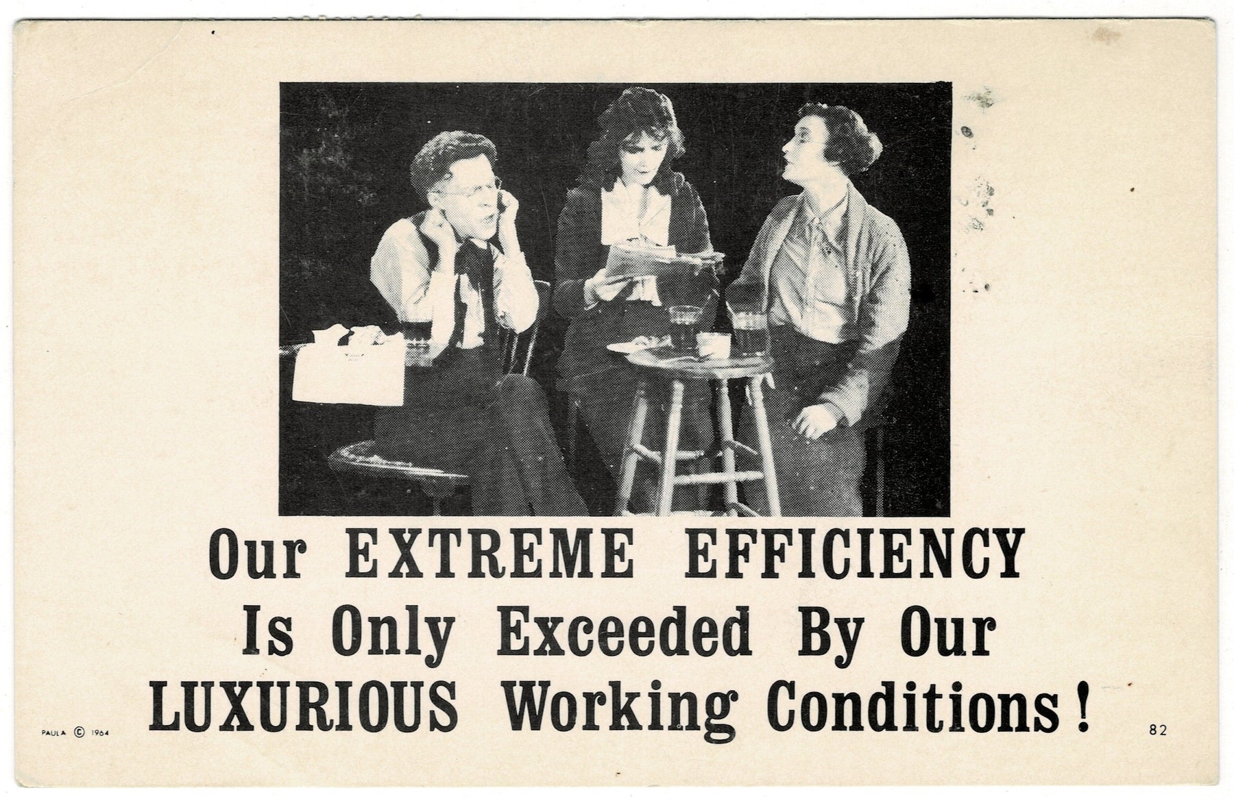 Step into a clever blend of Midwestern humor and classic British theatre with this vintage novelty postcard published in 1964 by the Paula Company of Cincinnati, Ohio. Known for its sharp, playful captions, the Cincinnati-based publisher paired a dramatic press photo from the 1939 stage production of Ladies in Retirement with a perfectly ironic line: “Our EXTREME EFFICIENCY Is Only Exceeded By Our LUXURIOUS Working Conditions!”
