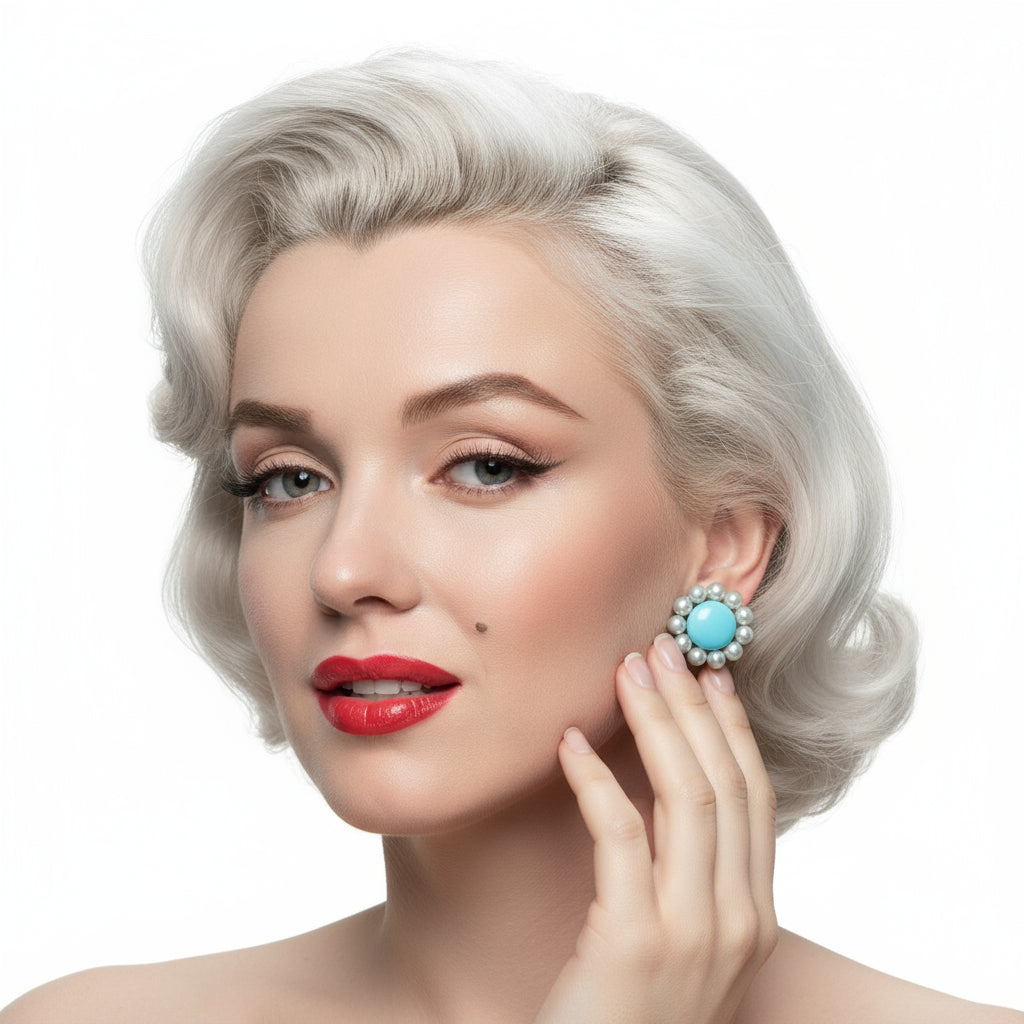 Vintage clip-on earrings from the late 1950s to early 1960s featuring light blue confetti lucite with silver accents. Surrounded by a ring of matching light blue costume pearls, the design is playful and bold, with a strong Rockabilly and retro vibe. Set in silver-tone metal and marked "JAPAN" on the back. Designed for non-pierced ears. Earrings are in excellent vintage condition. Ships with care.