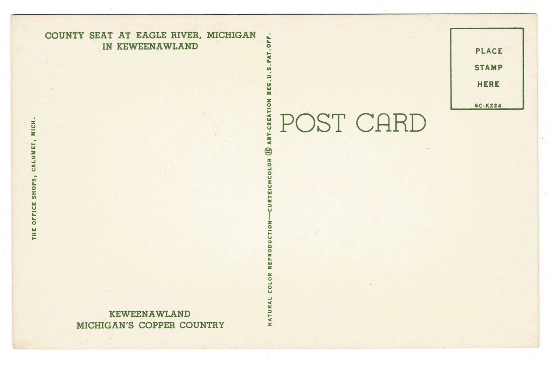 1956 Keweenaw County Courthouse Eagle River, Michigan Vintage Postcard, back view.