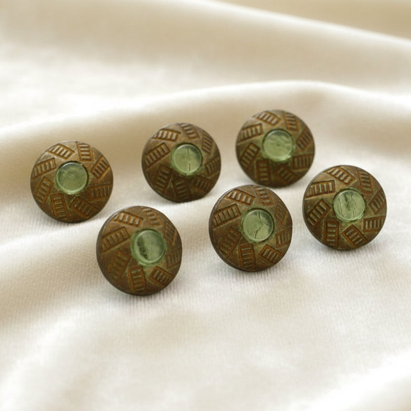 These six round translucent green and gilt glass buttons with self-shanks date to the 1920s.