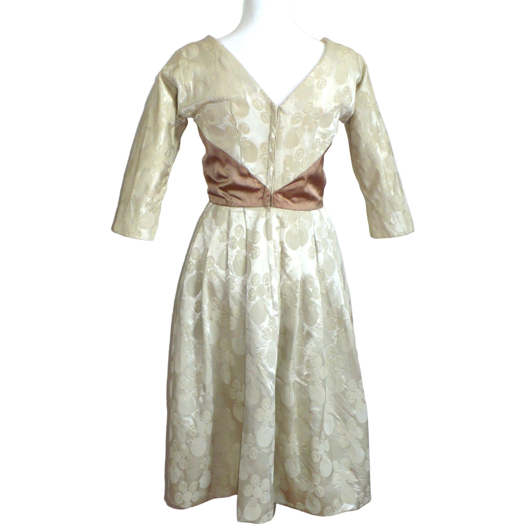 Step into winter soirées or a chic second-wedding celebration with this 1960s vintage party dress. Crafted from champagne-white jacquard woven with a playful “champagne bubbles” pattern, the dress features bronze satin insets at the waist for a touch of glamour. The three-quarter Dolman sleeves and V-neck create a flattering silhouette, while the bodice is lined in soft peach satin acetate for comfort.