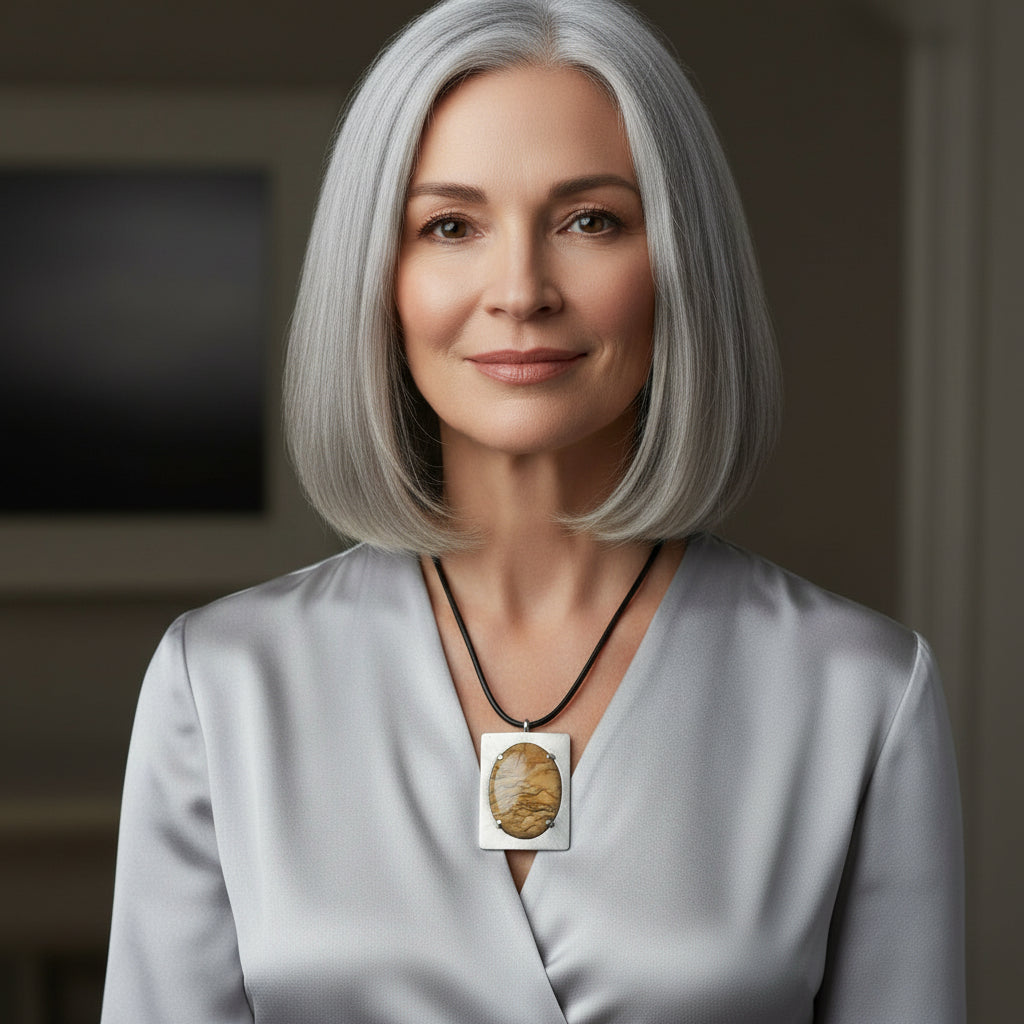 The centerpiece is a stunning Picture Jasper stone, known for its warm, earthy patterns and grounding energy associated with the root chakra. Set in sterling silver, the frame is simple yet elegant, allowing the natural beauty of the stone to take center stage.